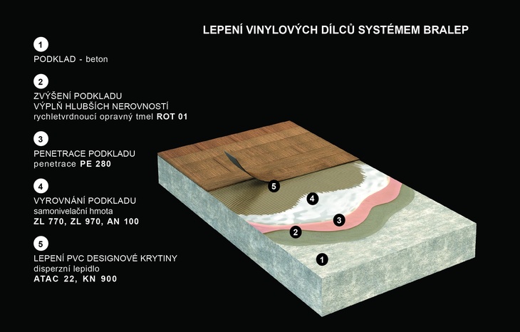 Před lepením všech typů podlahovin či dlažeb doporučuje výrobce upravit podklad pomocí vyrovnávacích a opravných hmot a následně ošetřit adekvátní systémovou penetrací, příp. hydroizolací. Nejprodávanější anhydritová samonivelační hmota BRALEP AN100 na bázi síranu vápenatého je díky absenci rozpouštědel při aplikaci zcela bezpečná a zdravotně nezávadná. Je určená k vyrovnávání podkladů v interiérech (včetně podlahového vytápění) do tloušťky vrstvy 30 mm. Vyznačuje se vynikajícím rozlivem bez smršťování, je pochozí po 8–12 hod v závislosti na tloušťce vrstvy a mikroklima interiéru. Pokládku podlahy (plovoucí, PVC, CV, textilní) lze provést za 24–48 hodin. K rychlému vyrovnání podlah před pokládkou krytin s vysokými nároky na rovinnost podkladu je ideální samonivelační vyrovnávací hmota BRALEP ZL970. Nanáší se v aplikační tloušťce 1–15 mm, je rychleschnoucí a po vyschnutí se vyznačuje vynikající pevností v tlaku 35 MPa. I díky tomu je vhodná pro pokládku parketových podlah.