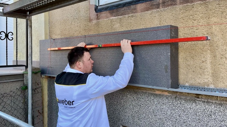 Na této stavbě se používá lepicí a stěrková hmota webertherm elastik. Desky tepelné izolace ISOVER Gray Wall EPS se lepí od rohů a od okrajů.