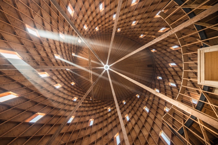 Konstrukce: | Kruhová dřevostavba, ručně tesané trámy a dřevěné lamelové konstrukce vyrobené pomocí CNC obrábění, kamenný sokl a hliněné podlahy. |