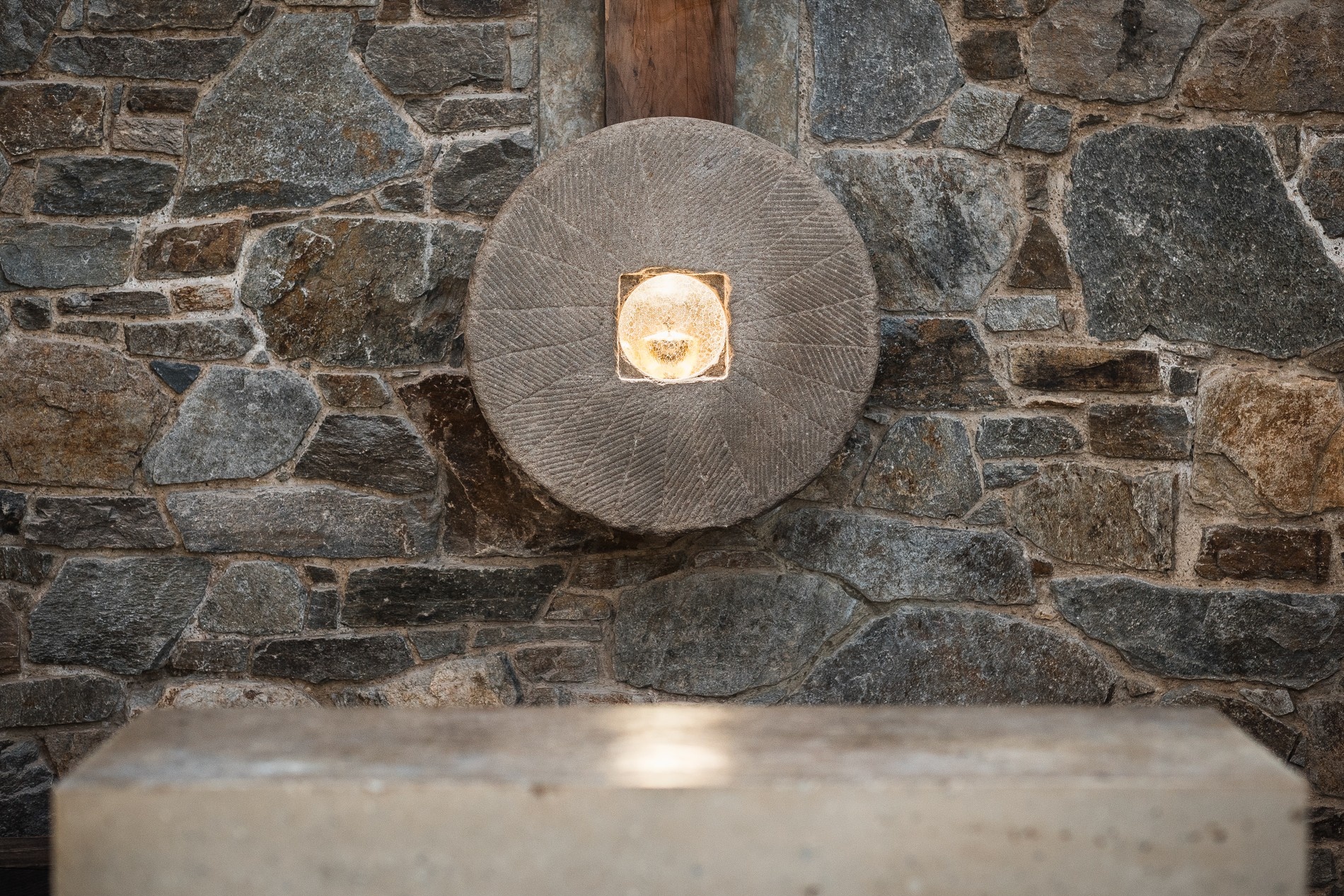 Plocha lemovaná jabloňovou alejí je opravdu velkorysá, při vstupu vás přivítají vysoká vrata, za nimiž se odehrává takřka dokonalé propojení historie se současností. Dřevěná stavba s kamennou podezdívkou, ručně tesané trámy, které nemilosrdně protínají prostor a směřují do kruhového otvoru ve stropě. Podlahu tvoří dusaná broušená hlína, stěny soklu lomový kámen. Zdá se, že kaple není ukotvena v čase – netušíte, kdy byla postavena. Vnímáte pouze její výraz, hru světla, akustiku a vůni…