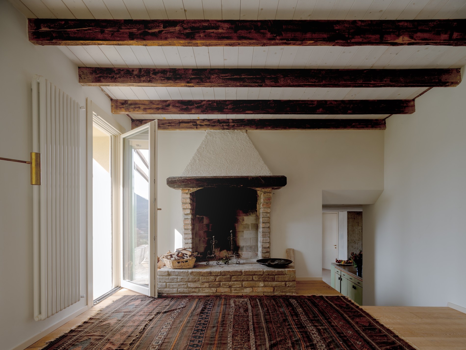 Téma ohně prostupuje domem a propojuje vzpomínky s modernou: ve staré části zůstává původní krb, zatímco ve stodole se novým ohniskem stává litinová kamna. Foto: Riccardo de Vecchi