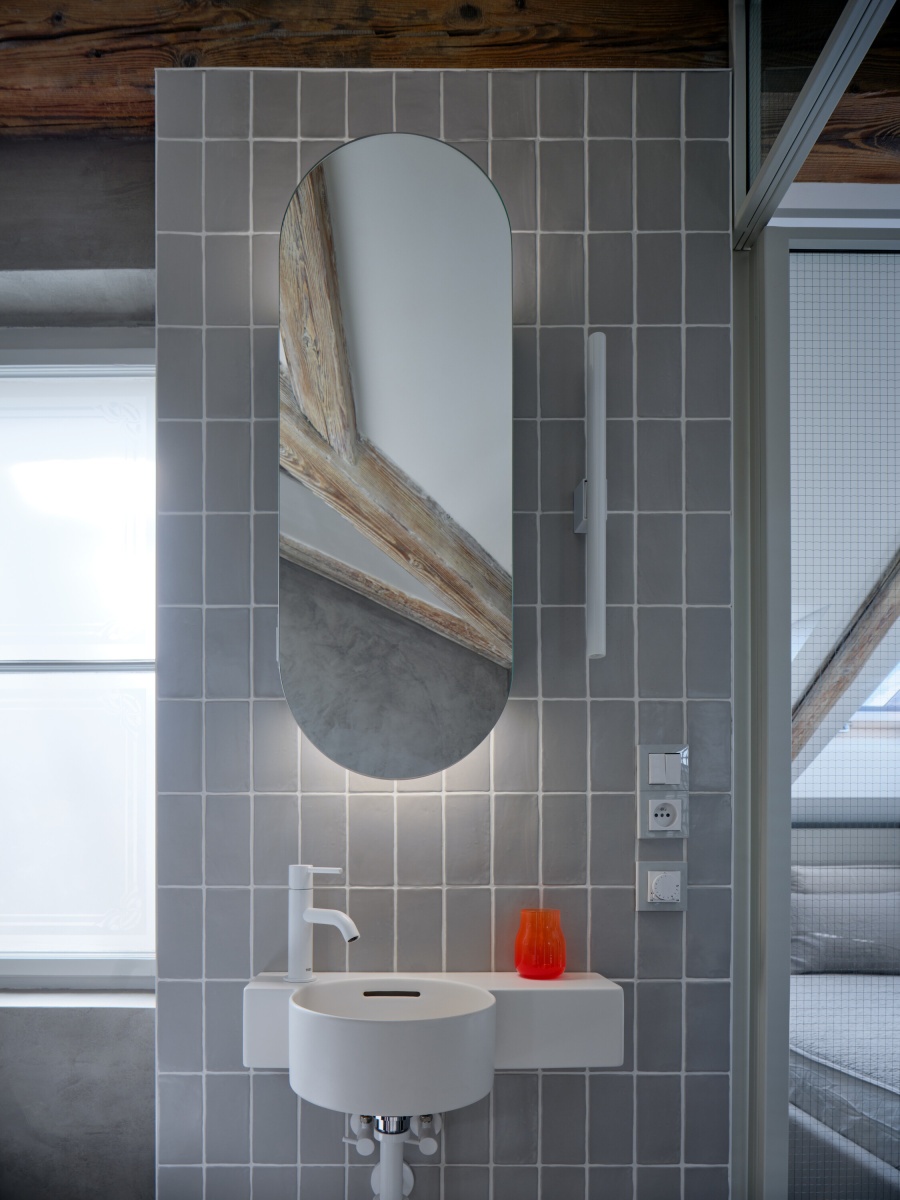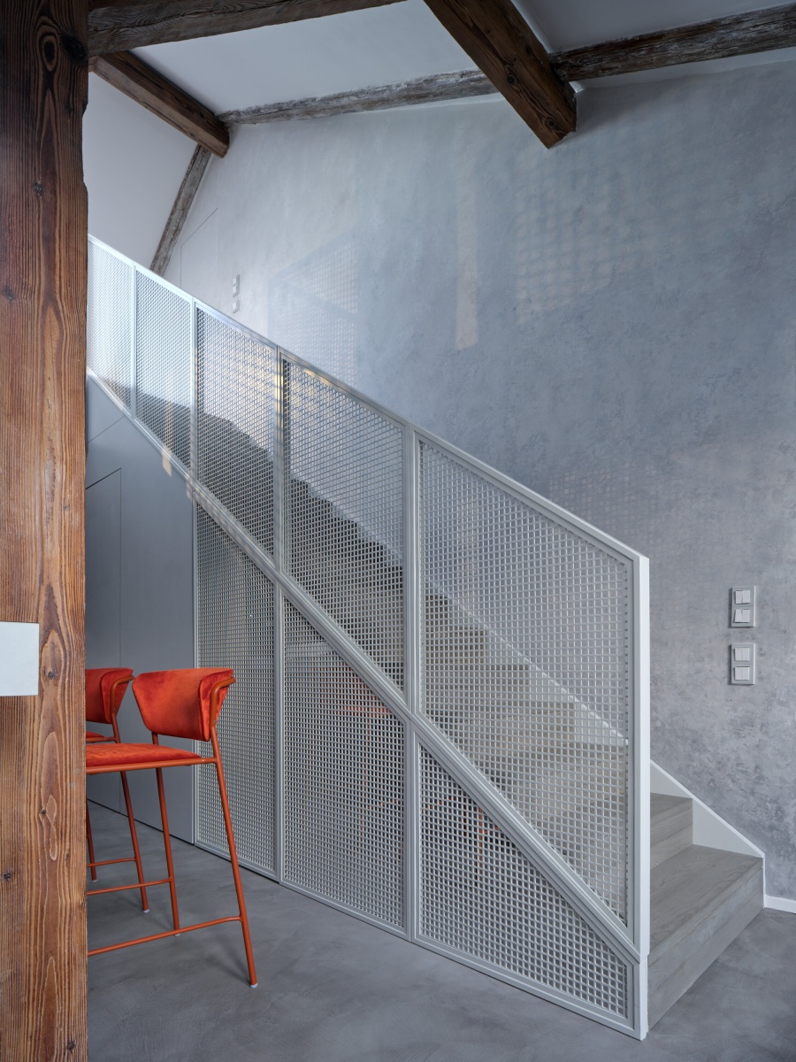 Velkou výzvou pro nás byla členitost starého půdního prostoru. Snažili jsme se s ním vypořádat citlivým zakomponováním jednotlivých prvků interiéru, které jsme navrhli a nechali vyrobit, jak je u nás zvykem, většinou na míru. Výsledkem je harmonický kontrast mezi moderními vloženými prvky a starým příběhem vyprávěným trámy původního krovu. Tento dialog mezi historickým a moderním dodává prostoru jedinečný charakter a vytváří poutavé prostředí pro jeho obyvatele.