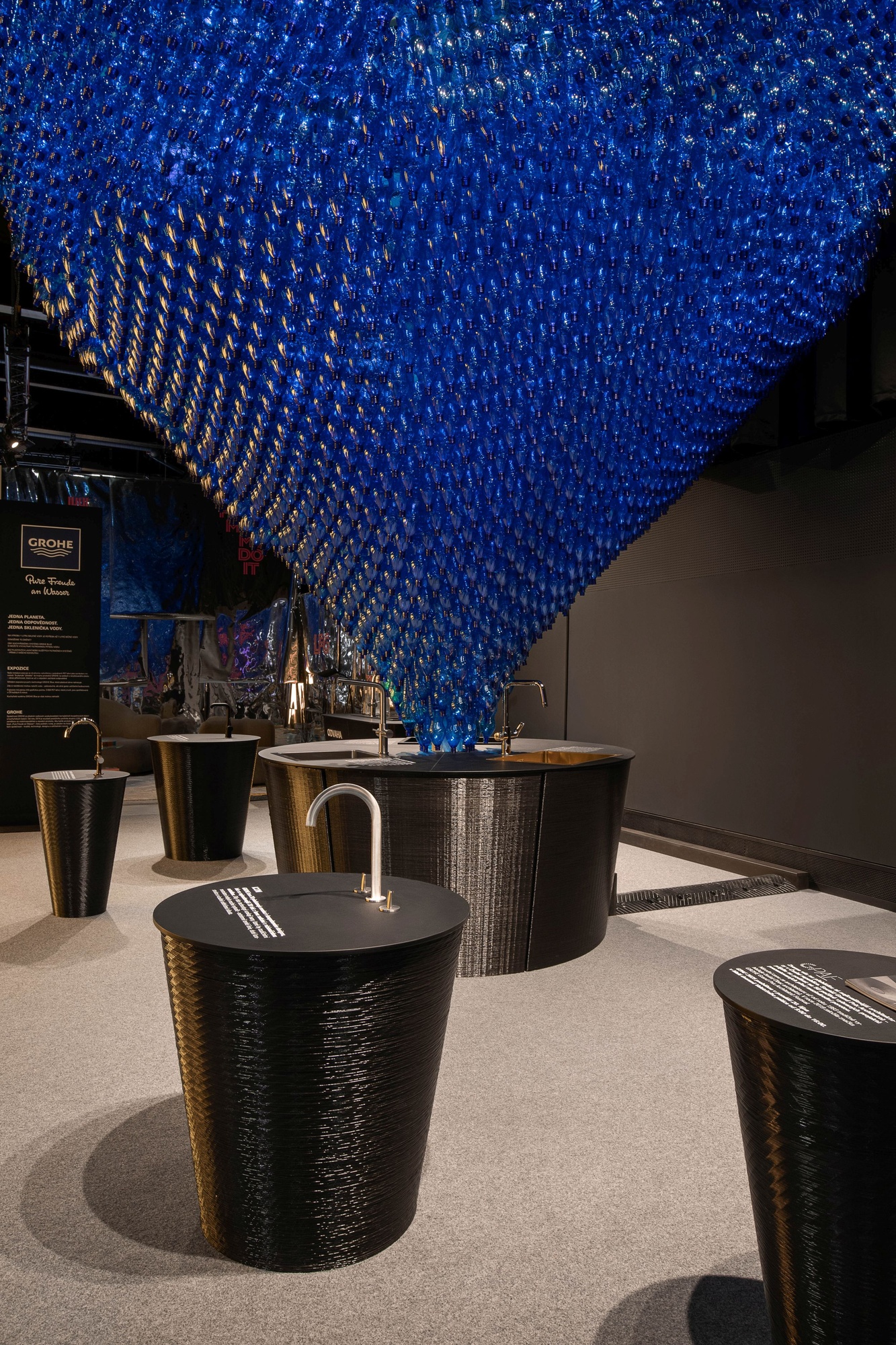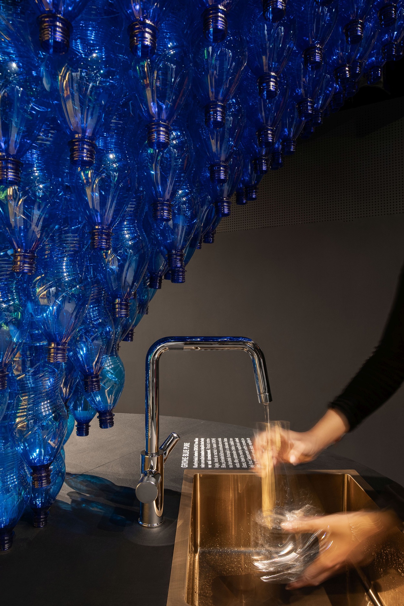 Instalace tvořená ze 3 600 recyklovaných PET lahví symbolizuje minulost – právě tolik lahví se totiž v České republice spotřebuje každých pět minut. Tento obraz postupně přechází do současnosti, kterou představují sokly z recyklovaného plastu. Budoucnost pak ztělesňuje technologie GROHE Blue – inovativní kuchyňské systémy poskytující filtrovanou, chlazenou i sycenou vodu přímo z kohoutku. Nabízejí chytrý způsob, jak s jejich pomocí lze omezit spotřebu plastů: čtyřčlenná domácnost díky nim může ušetřit až 800 lahví ročně a zároveň tak snížit spotřebu vody i produkci CO2 spojenou s jejich výrobou. Systém GROHE Blue si mohou návštěvníci na místě vyzkoušet a natočit si z něj neperlivou, jemně perlivou nebo perlivou vodu – jednoduché, ale silné gesto udržitelné budoucnosti.