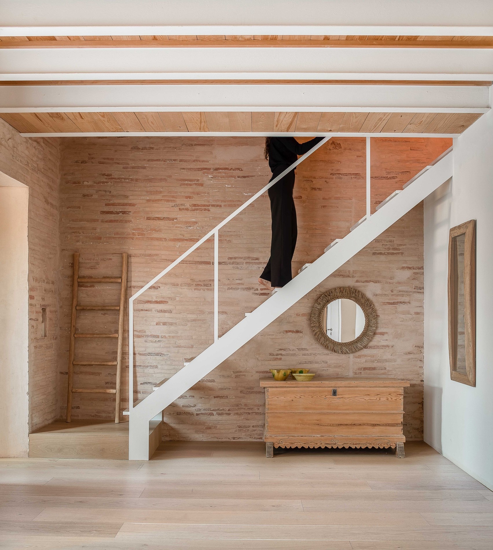 Horní byt je koncipován jako mezonet, přičemž hlavní obytná zóna se nachází v prvním patře. Schodiště vede do podkroví, kde se otevírá obytný prostor pod šikmou střechou. Foto: Jorge Peiró