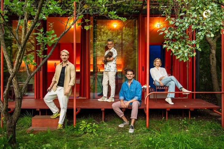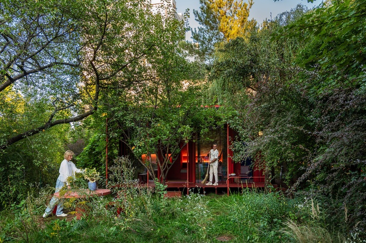 Kompaktní místnosti se díky velkým proskleným plochám volně propojují se zahradou a v teplých dnech lze stěny otevřít. Venku ta bujaře rostoucí zeleň kontrastuje s třešňově–malinovými tóny brány, cesty, pergol nebo stolu – a především s barvami interiéru. Barevný dům už snad menší ani být nemůže, ale jeho dopad v zahradě je neopomenutelný. Idea vizuálního maximalismu, malého díla s výrazným efektem, je tu dotažena naplno. To obydlí v zahrádkářské kolonii má přitom charakteru na rozdávání.