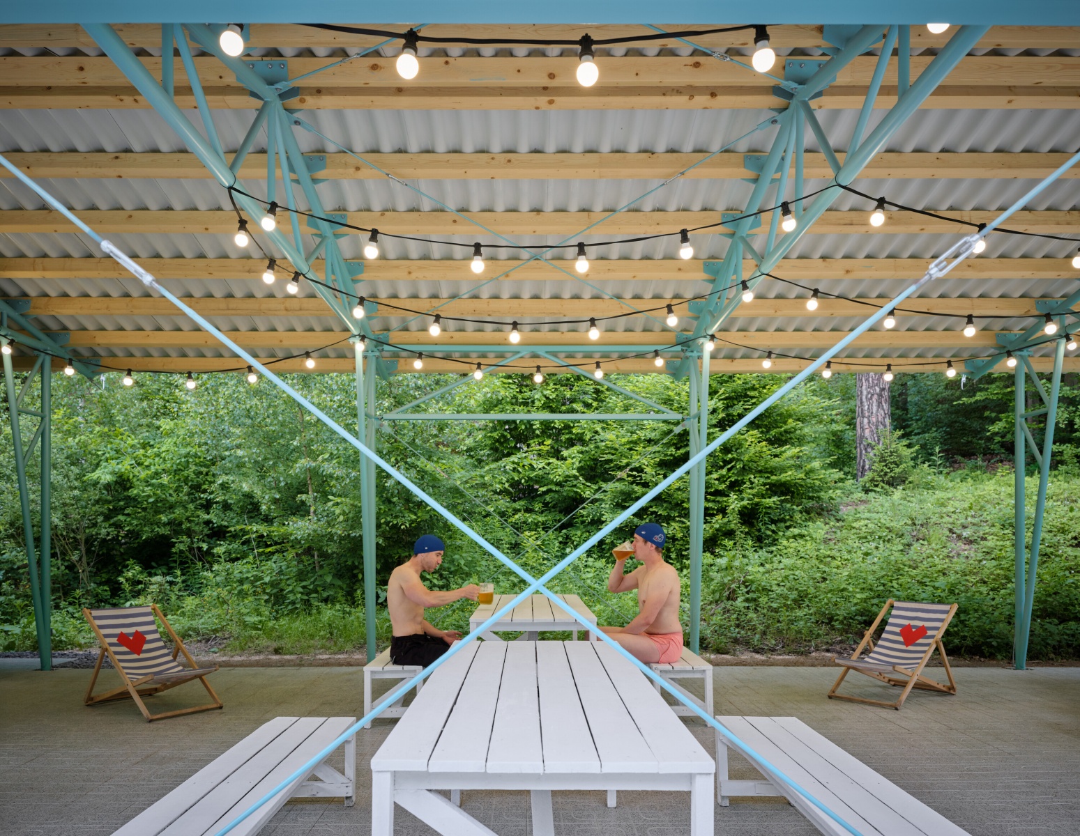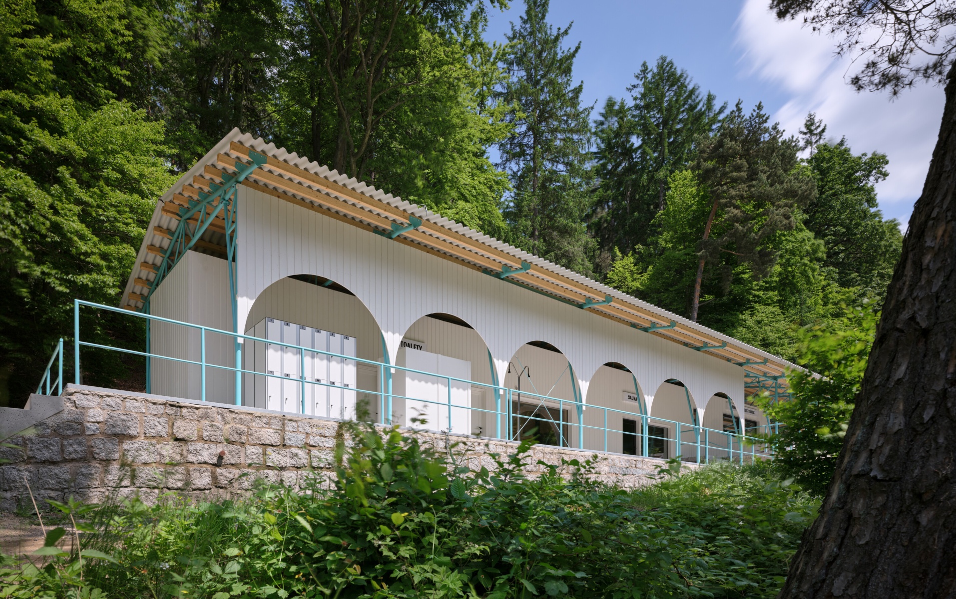 Lesní koupaliště, o němž zde bude řeč, je přesně tím zařízením, které si nehraje na žádné opulentní lázně, ale vychází z tradice koupaliště navrženého v roce 1934. Svým provedením odpovídalo době, což se odráží i v dnešní reinkarnaci místa. Ta jednoduchost však není vůbec na závadu, zvláště pokud postřehnete, jak zařízení vznikalo, kolik bylo, či spíše nebylo peněz na realizaci. Výsledek? Místo má určitou poetiku předešlých časů, jednoduché zastřešené části s buňkami infrastruktury a jistou kulisovostí oblouků fasád. Vše tak trochu připomíná paravány a jednoduché části staveb první republiky. Pro tyto účely a v těchto intencích zcela dostačující řešení, které si na nic nehraje, a přesto je svébytné a živé. Jistá poetika místa zde přežila z dob předešlých.