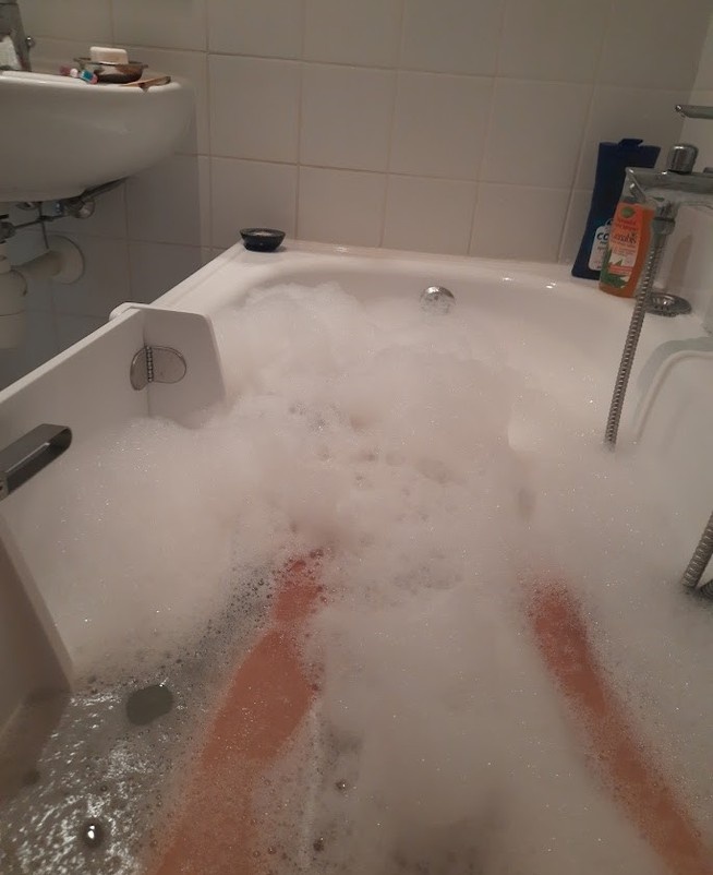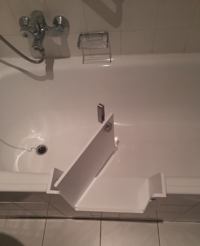 Výsledná podoba zásahu je vidět na obr. 5. Po 24 hodinách je možno využít vanu pro koupel (obr. 6). Podle původního osazení vany vznikne různě vysoký schodek mezi dnem vany a podlahou koupelny. Při zvýšené poloze vany je možno používat odnímatelný plastový schodek. Výsledným řešením je snadný přístup do vany pro osoby s omezenou pohyblivostí. Pro bezpečnější pohyb během koupele je ke stěně připevněno madlo.
