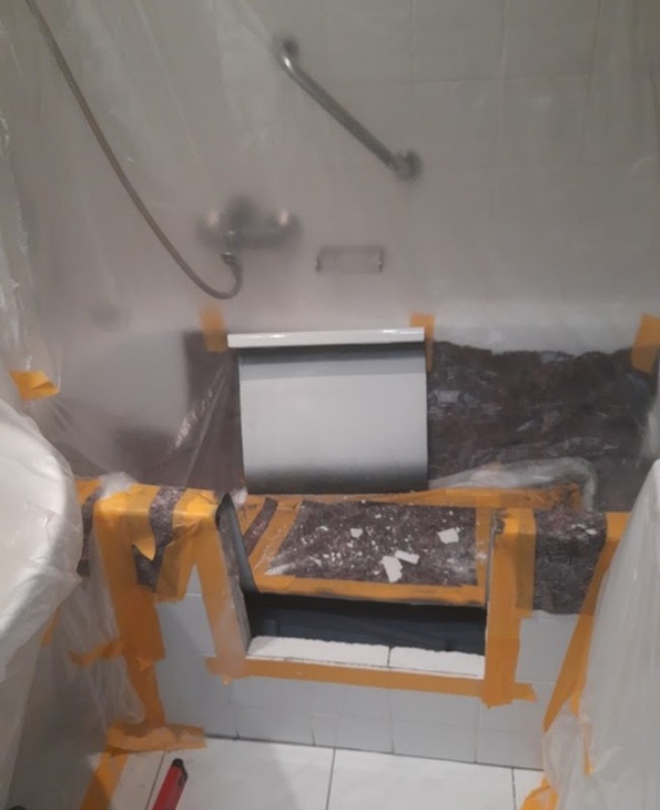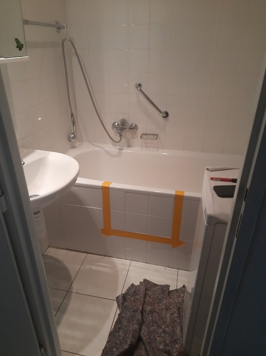 Nejmenší a nejkratší zásah do provozu bytu je využitím netradičního řešení osazením vstupních dvířek do stávající vany (obr. 1). Firma si provede zaměření stávajícího stavu a na jeho základě si vyrobí dvířka, která následně osadí do tělesa vany. Vlastní montáž spočívá v zakrytí stěn a zařízení koupelny. Během práce se nemusí vymístit žádné ze stávajících zařízení (např. pračka). Následně se provede vymezení budoucího otvoru do stěny vany (obr. 2).