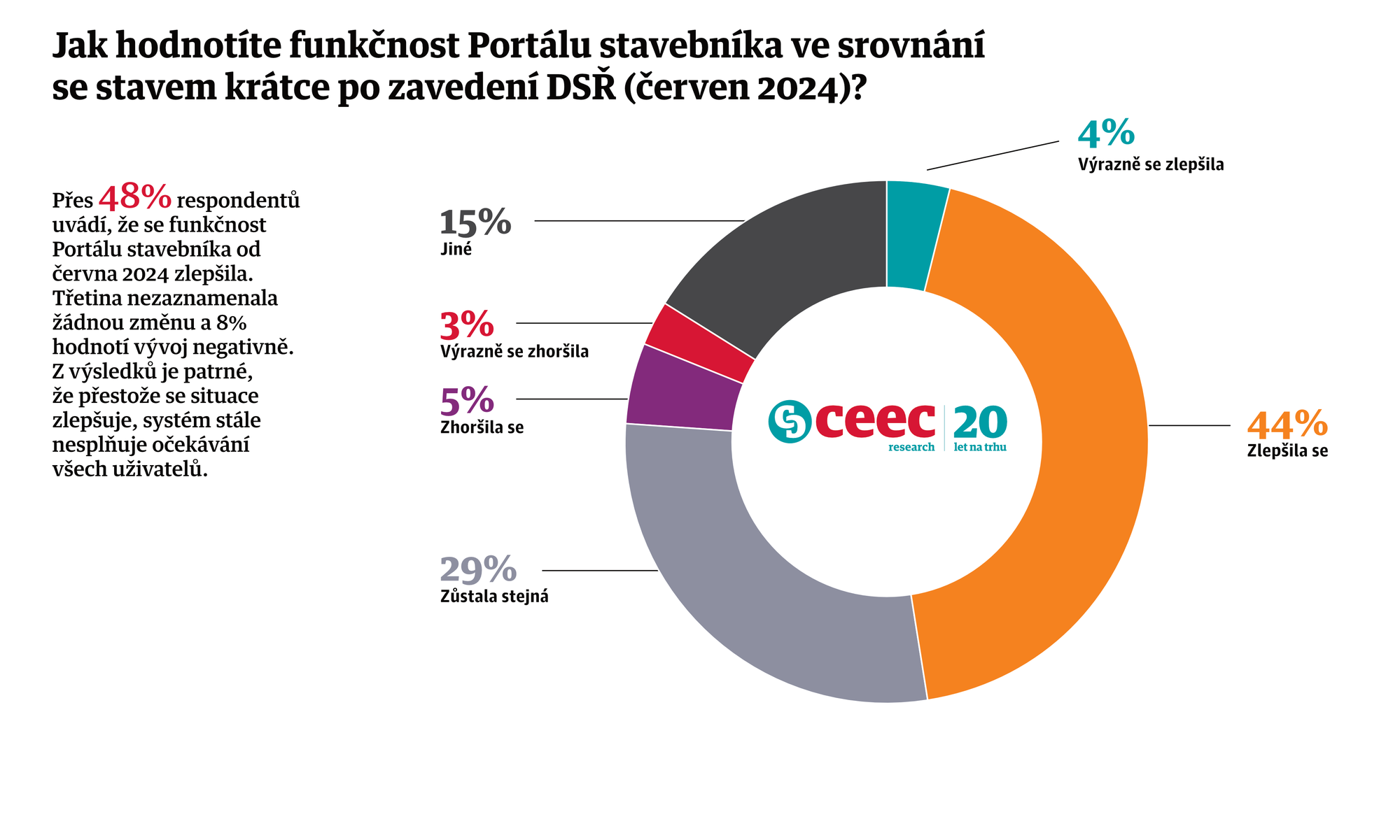 Stav digitalizace stavebního řízení se v posledním roce zlepšil. Téměř polovina (48 %) zástupců měst, obcí, krajů a stavebních úřadů uvádí, že Portál stavebníka je oproti loňsku funkčnější. Přesto většina úřadů však upozorňuje, že systém stále běží s obtížemi. Vyplývá to z aktuálního průzkumu CEEC Research, kterého se na přelomu září a října zúčastnilo 631 respondentů z celé republiky.