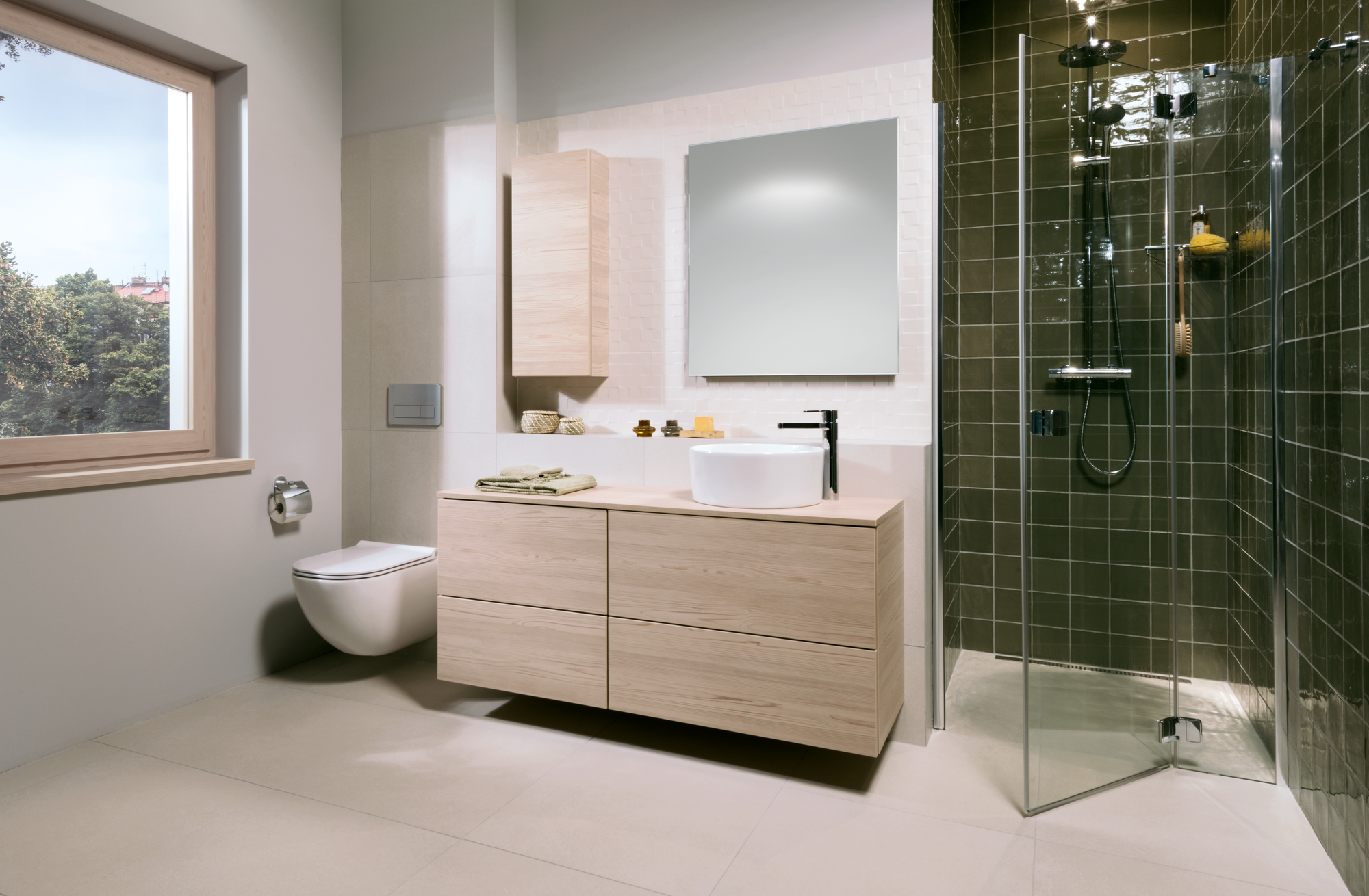 Oblé tvary a linie působí jemným a uklidňujícím dojmem. Umyvadlová mísa Cubito značky JIKA navíc disponuje i tenkými hranami, díky čemuž nevypadá příliš robustně. Perfektně vynikne v kombinaci s podumyvadlovými deskami Mio ve světlém dřevodekoru. Zdroj: JIKA – Laufen CZ