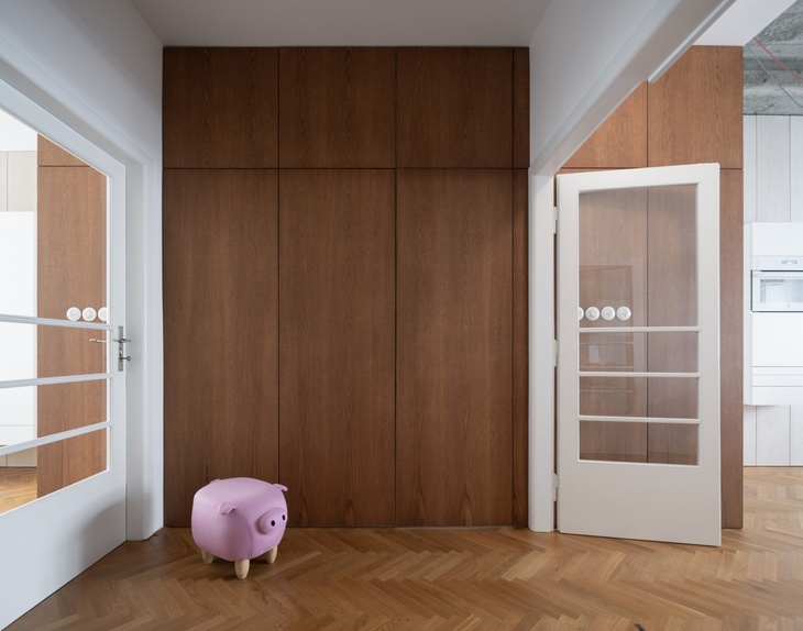 Náš dvoupokojový byt je případ, kdy zde funkcionalismus máme dobově jasně zakotvený a pracujeme s ním při kompletní rekonstrukci. Pro vysvětlenou, proč je „růžové prasátko“ součástí názvu. Je to dárek od přátel, taburet do předsíně, krásná nadsázka a vtipný maskot, barevné ozvláštnění haly.