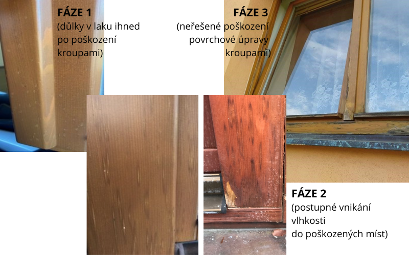 Při dopadu krup na povrch oken působí velká síla a rychlost. Tím vznikají v okenním nátěru povrchové důlky. Zpočátku se tyto defekty jeví jako nic zásadního, nicméně neřešené mohou vést k závažným poškozením dřevěných oken.