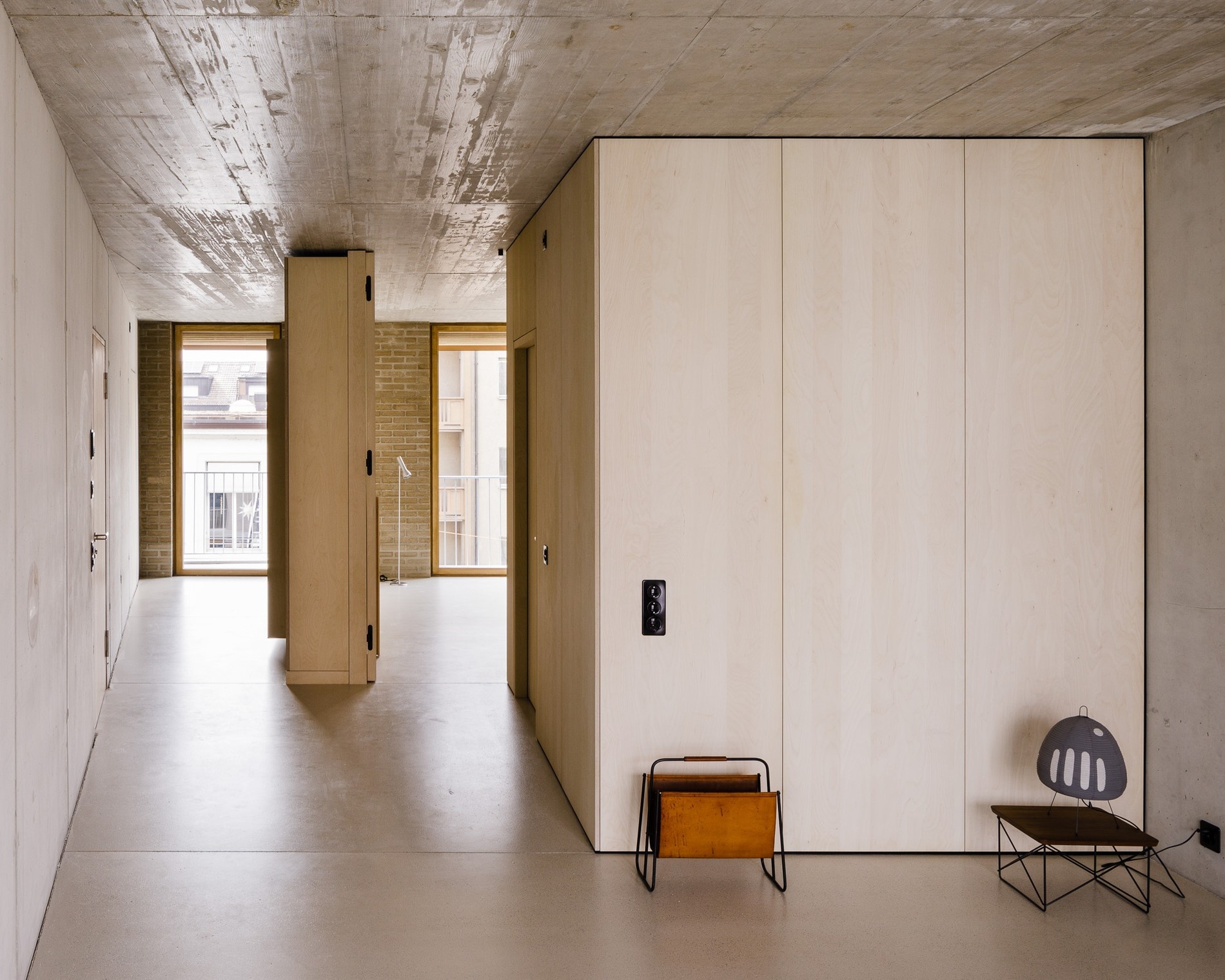 Právě tyto perspektivní skvosty a prostorové triky dělají bydlení zde příjemným. Úrovně bytů, které tvoří hranice mezi místnostmi, jsou tvořeny betonem, se stěrkovu úpravou. Světlé březové povrchy působí zase jako pohledový protipól té tvrdosti. Veškeré instalace jsou zabudované za obložením, a uzavřený prostor je chytře využit, takže žádný prostor nezůstává nevyužitý.