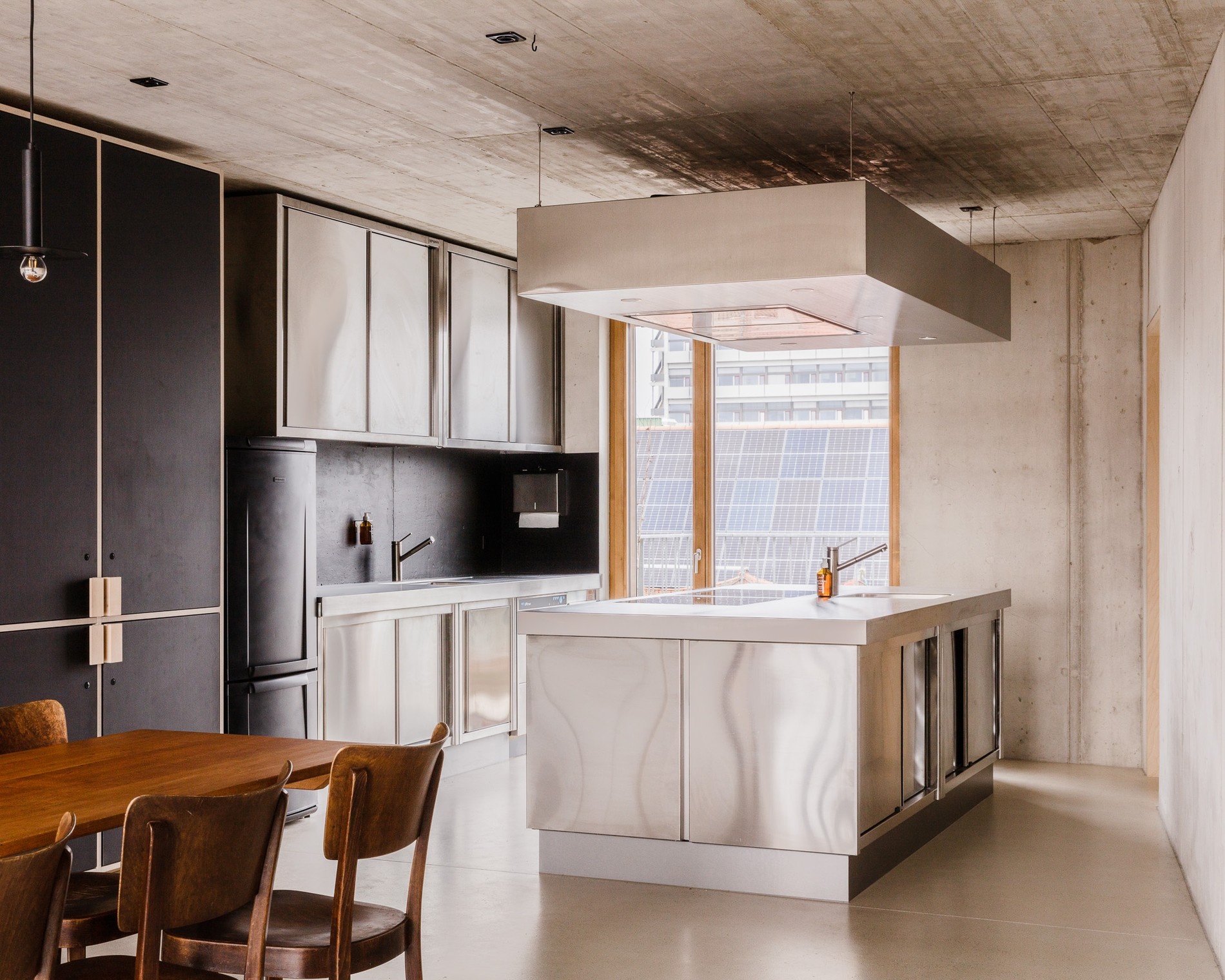 Pohled návštěvníka tak buď nerušeně bloudí po betonových a dřevěných površích, anebo je přirozeně sváděn směrem k vnějším stěnám a oknům, za světlem.