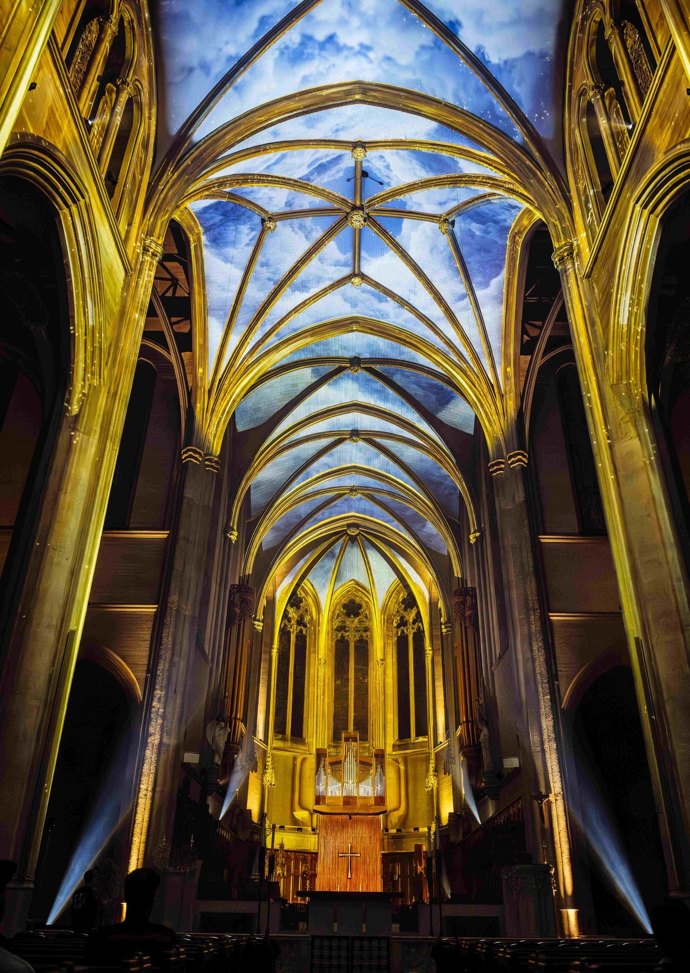 Tvůrci instalace, mistři z MomentFactory, přitom ctí památku katedrály. Propojují její minulost se současností. Dávají dohromady tradici s inovací, rozšiřují její duchovní význam o kulturní. Foto: AURA Grace Cathedral, Moment Factory.