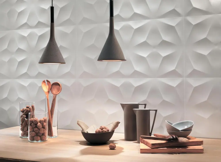 Plastické povrchy fungují samy o sobě, ale také v mixu s hladkými dlaždicemi v jednolitých odstínech, imitaci přírodních (dřevo, kámen) i industriálních materiálů (beton). Klíčové je přitom osvětlení, které strukturu dlaždic ještě zvýrazní, prohloubí kontrast světla a stínu a koupelnu i interiér promění doslova před očima.