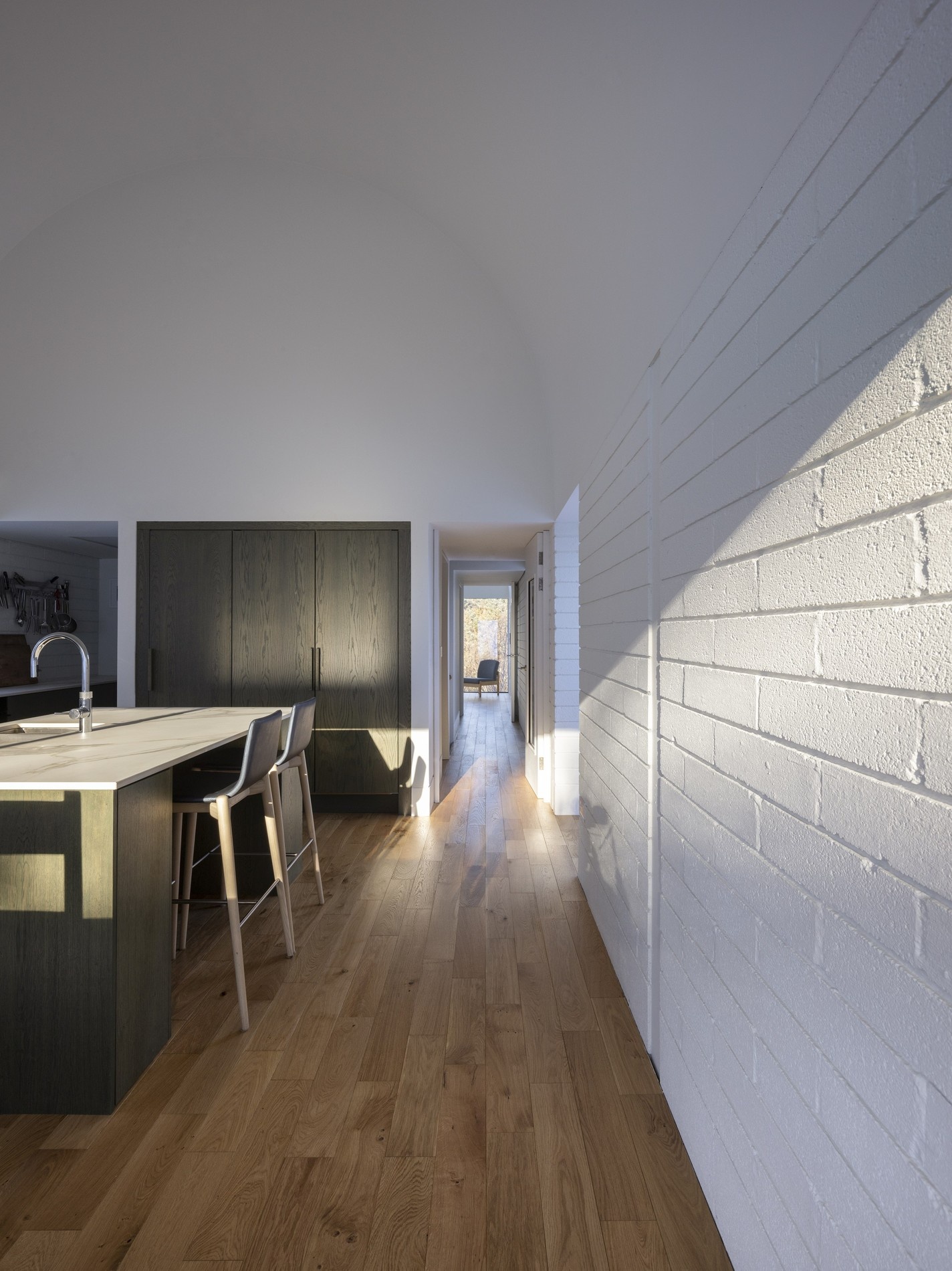 Jen klenutí stropu napovídá, že to není konvenční dům. Interiér ale plně odpovídá současným nárokům na moderní bydlení. Foto: Aisling McCoy Photographer