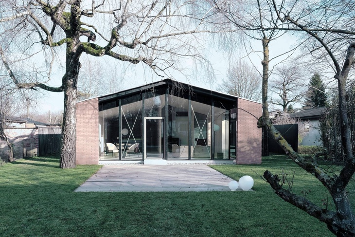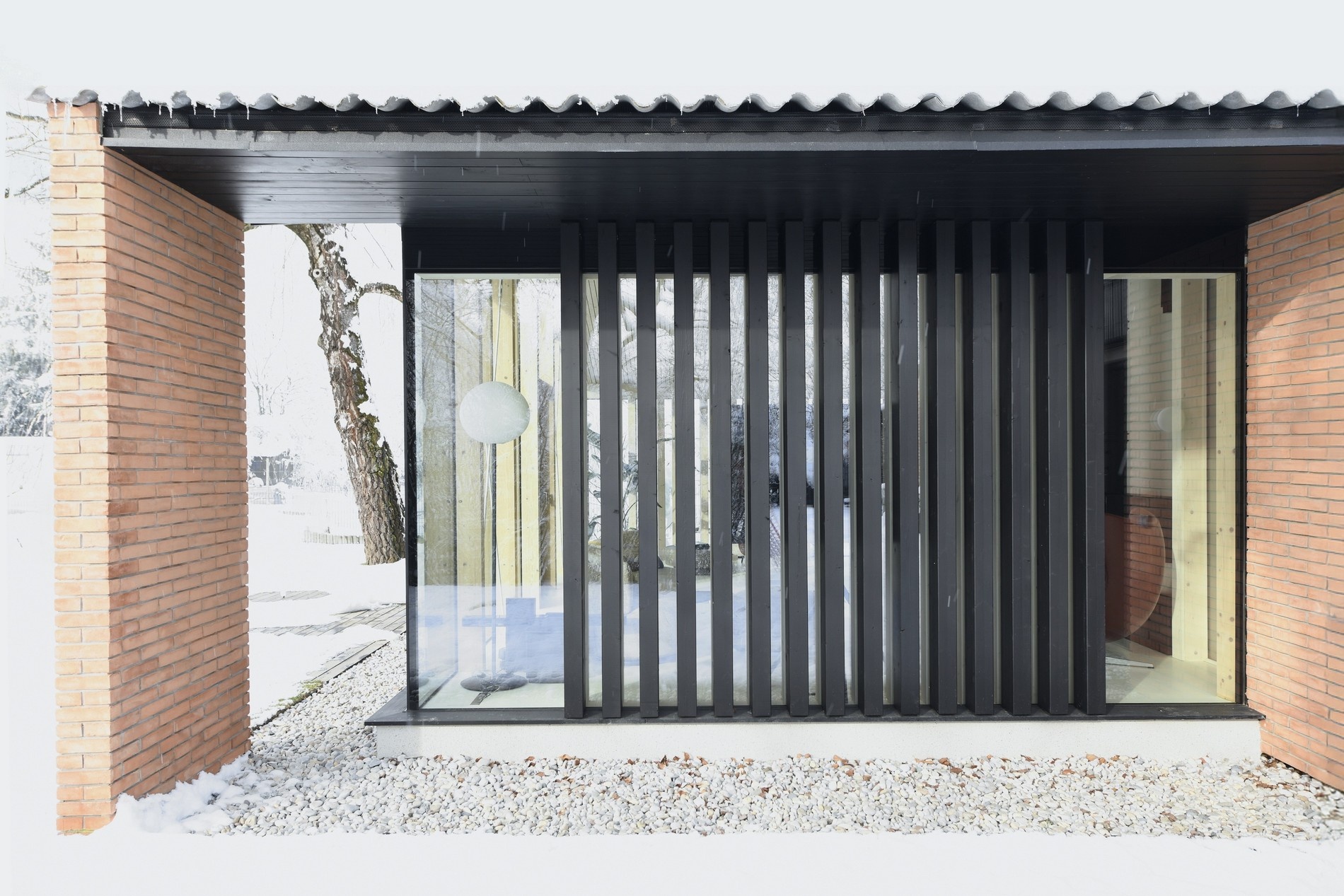 Nový objem je koncipován jako lehký pavilon připomínající skleník: dřevěno-skleněný prostor pod prodlouženou střechou propojující staré i nové do jedné siluety. Dva cihlové sloupy, identické s těmi na původní fasádě, fungují jako kotvy – jemný signál, že přístavba patří do tradice Murgle. Vertikální dřevěné boční stěny poskytují útočiště a soukromí, zatímco transparentní fasáda se zcela otevírá do zahrady.