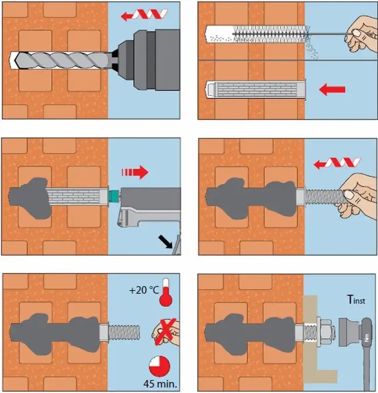 • Správný postup: Otvor je nutné minimálně 2× vyfouknout a 2× vykartáčovat ocelovým kartáčkem. Jen dokonale čistý povrch zaručí deklarovanou únosnost.