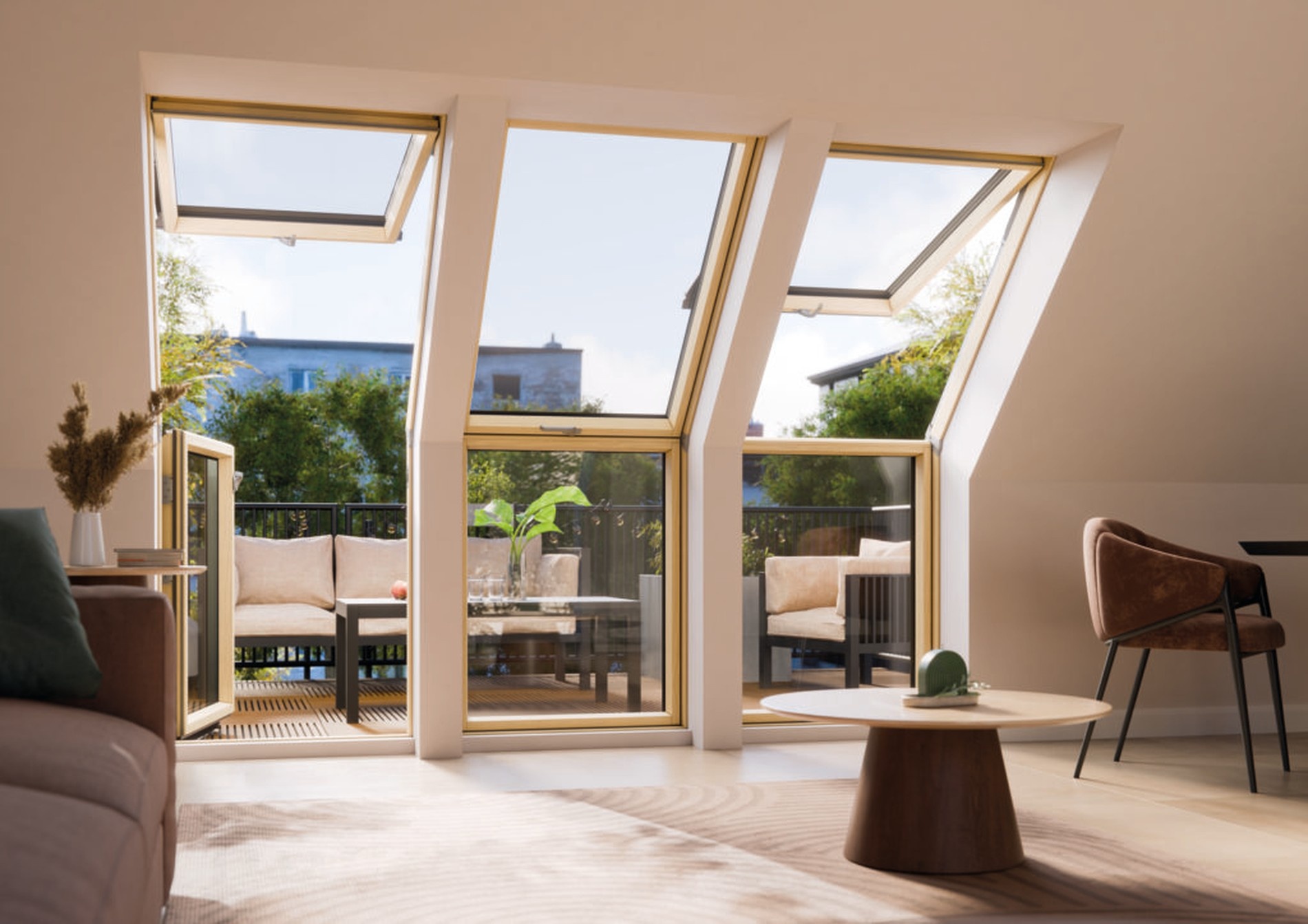Velkoformátová střešní okna pro vstup na balkon nebo terasu. Zdroj: Fakro