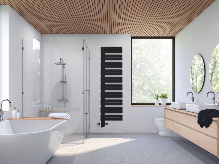 Asymetrický design není jen estetickou volbou, je to promyšlené funkční řešení. Konstrukce je tvořena bočně otevřenými prvky vždy dvou vodorovných plochých trubek (70 × 11 mm), které jsou napojeny na svislé kulaté sběrné trubky (ø 38 mm). Právě toto uspořádání umožňuje velmi pohodlné zavěšení ručníků ze strany a jejich předehřátí. Na rozdíl od klasických žebříkových radiátorů je nemusíte složitě provlékat – stačí je jednoduše nasunout.