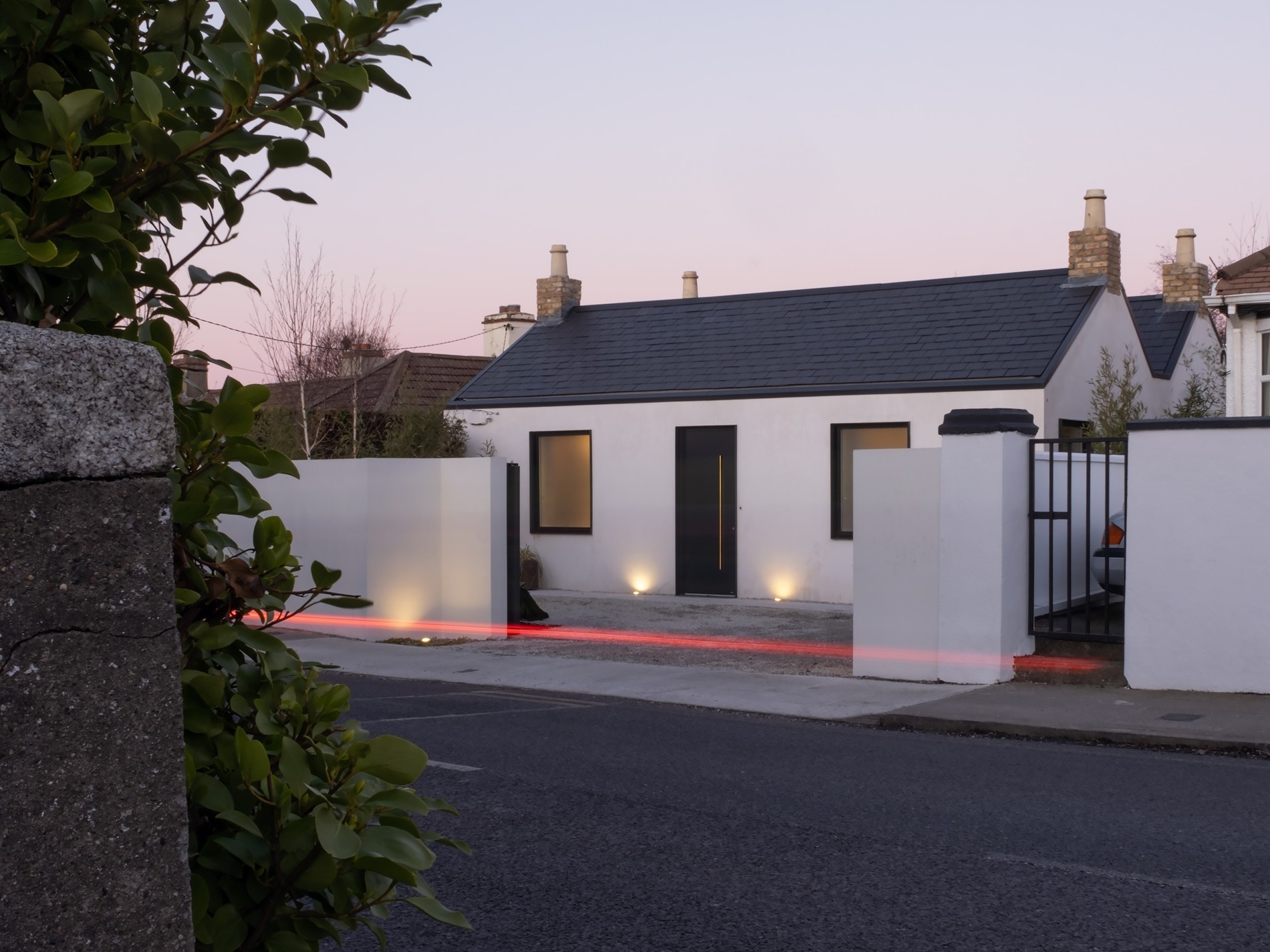 Zvenčí je Beaumont Lodge natřena bílou barvou a okenní otvory rámují ocelové ostění. Zapuštěné okapy zajišťují, že nejsou viditelné žádné svody ani okapy. Foto: Shane Lynham
