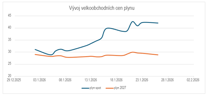 U elektřiny zůstává situace klidnější. Spotové ceny sice v poslední době mírně rostou v důsledku vyšší zimní poptávky a nižší výroby z obnovitelných zdrojů, nárůsty o několik desítek eur za megawatthodinu však nelze považovat za extrémní. U kontraktů s delší dobou dodávky je patrný spíše pozvolný růst cen, který souvisí hlavně s pokračujícím zdražováním emisních povolenek. Ty zůstávají jedním z hlavních faktorů, jež zhruba od loňského března brání výraznějšímu poklesu velkoobchodních cen elektřiny. Velkoobchodní ceny elektřiny na rok 2027 jsou nicméně stále mírně pod úrovní kontraktů na rok 2026 z konce loňského roku.