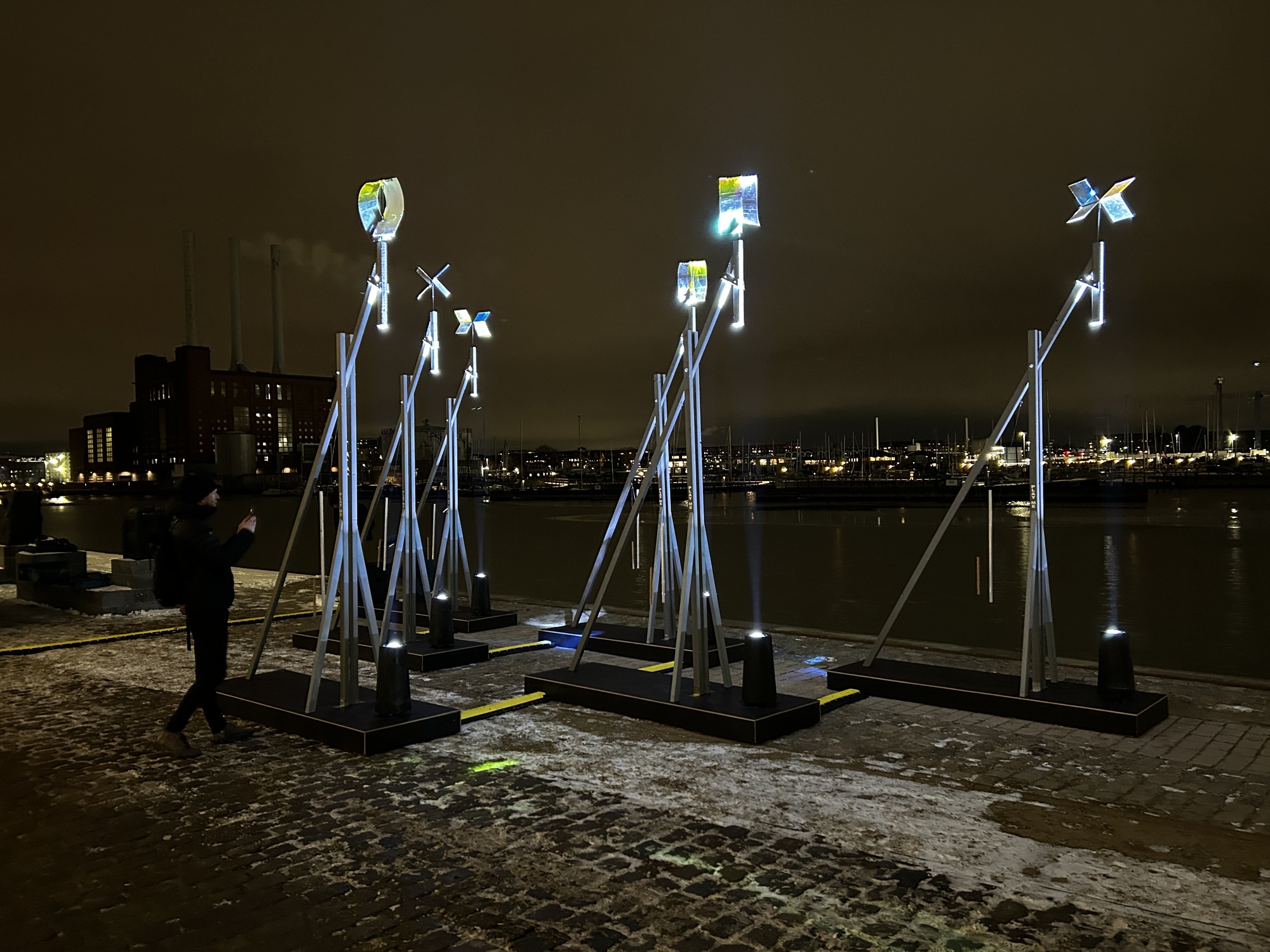 Dílo tvoří šest stylizovaných lodí, jejichž světelné paprsky propojují hladinu vody, oblohu i okolní architekturu. Instalace reaguje na proměnu bývalého průmyslového přístavu v moderní čtvrť vybudovanou na umělém ostrově. Instalace je kynetická díky pohybu korouhviček potažených speciálními (dichroickými) foliemi roztáčených silou větru.