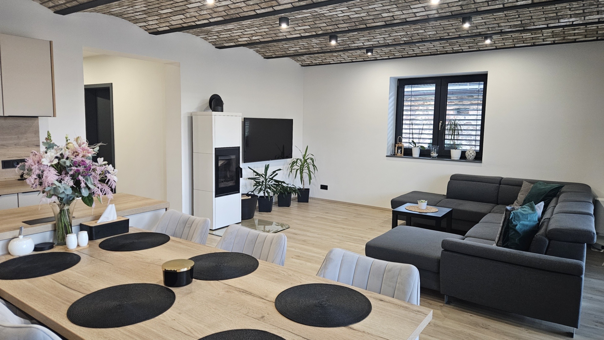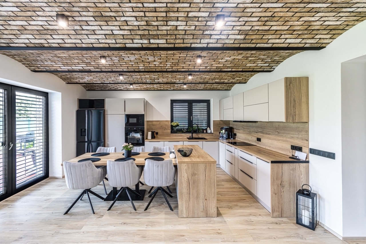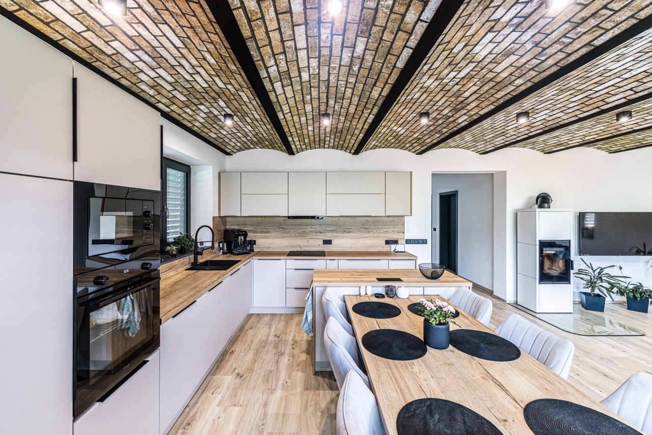 Interiér domu pokračuje v logice kvalitních a nadčasových materiálů. Místo klasických stropů zde vznikly valené klenby vyzděné přímo z cihel, které dávají prostoru výjimečný charakter. Takové řešení je u rodinných domů velmi vzácné a vytváří atmosféru, která připomíná historické stavby, ale přitom působí moderně a elegantně. Klenby přinášejí nejen estetický efekt, ale také zajišťují přirozenou propojenost a vizuální kontinuitu jednotlivých místností. Klenby doplňují moderní jemné tóny a přírodní materiály. Dřevo, neutrální dlažba a střídmá barevnost vytvářejí prostředí, které působí klidně, vyváženě a odolává krátkodobým trendům. Celý prostor tak drží jednotnou estetiku, která souzní s architekturou domu i jeho fasádou.
