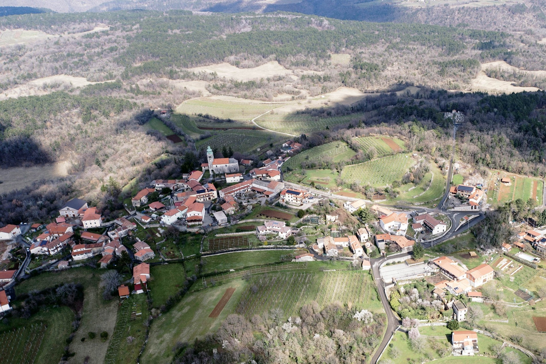 Na vrcholu kopce s výhledem na Krasovou plošinu leží vesnice Avber, těsně semknuté sídlo formované kamenem, větrem a časem. Zde byla citlivě revitalizována usedlost pro australského klienta, jehož rodinné kořeny sahají právě do této obce. Foto: J. Martinic