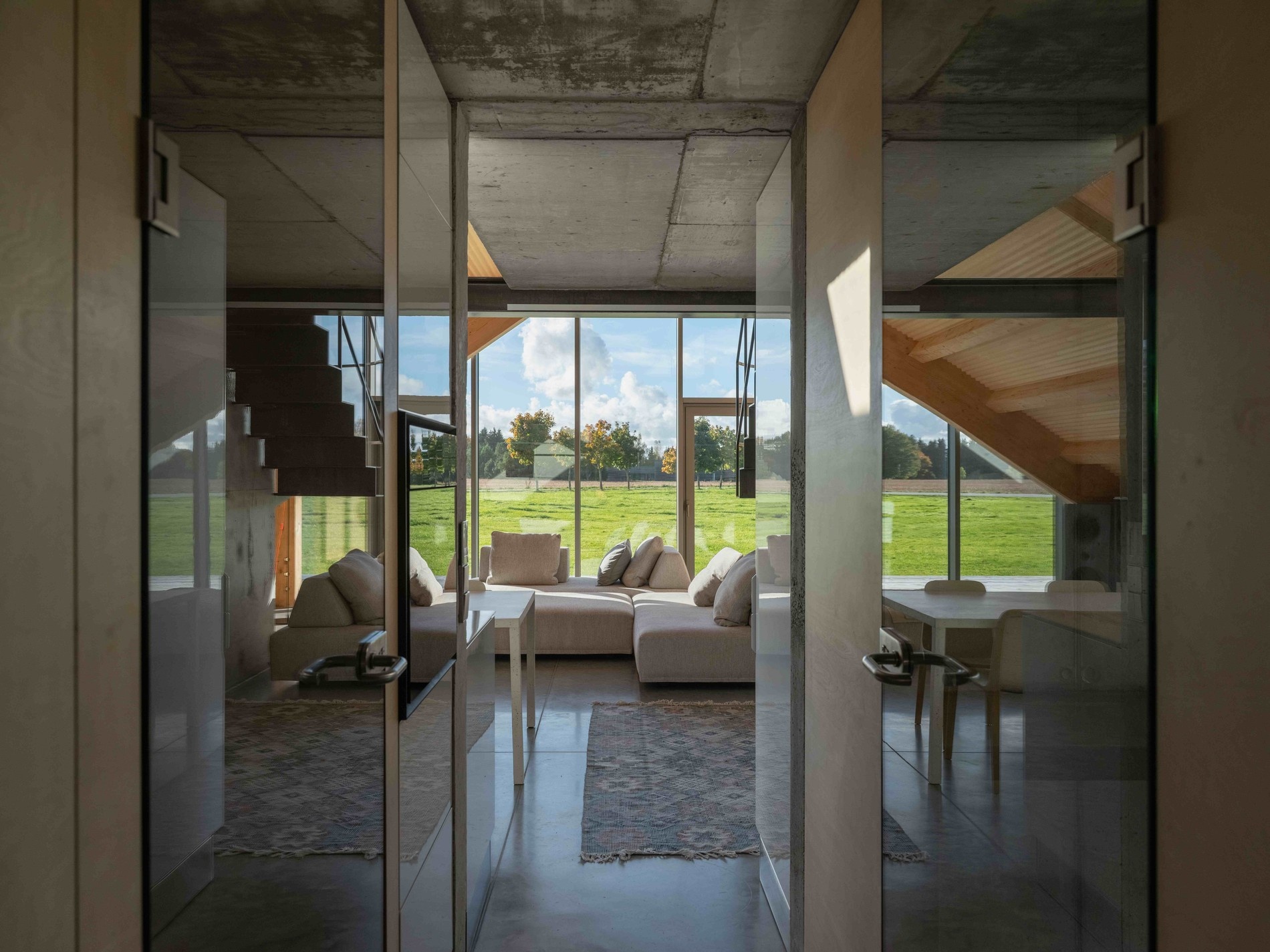 Charakter interiéru je utvářen konstrukcemi z odhaleného lepeného dřeva (třída GL28h). Masivní dřevěné rámy dodávají prostoru rytmus a teplo, které změkčují industriální chlad leštěných betonových podlah. Foto: Lukas Mykolaitis