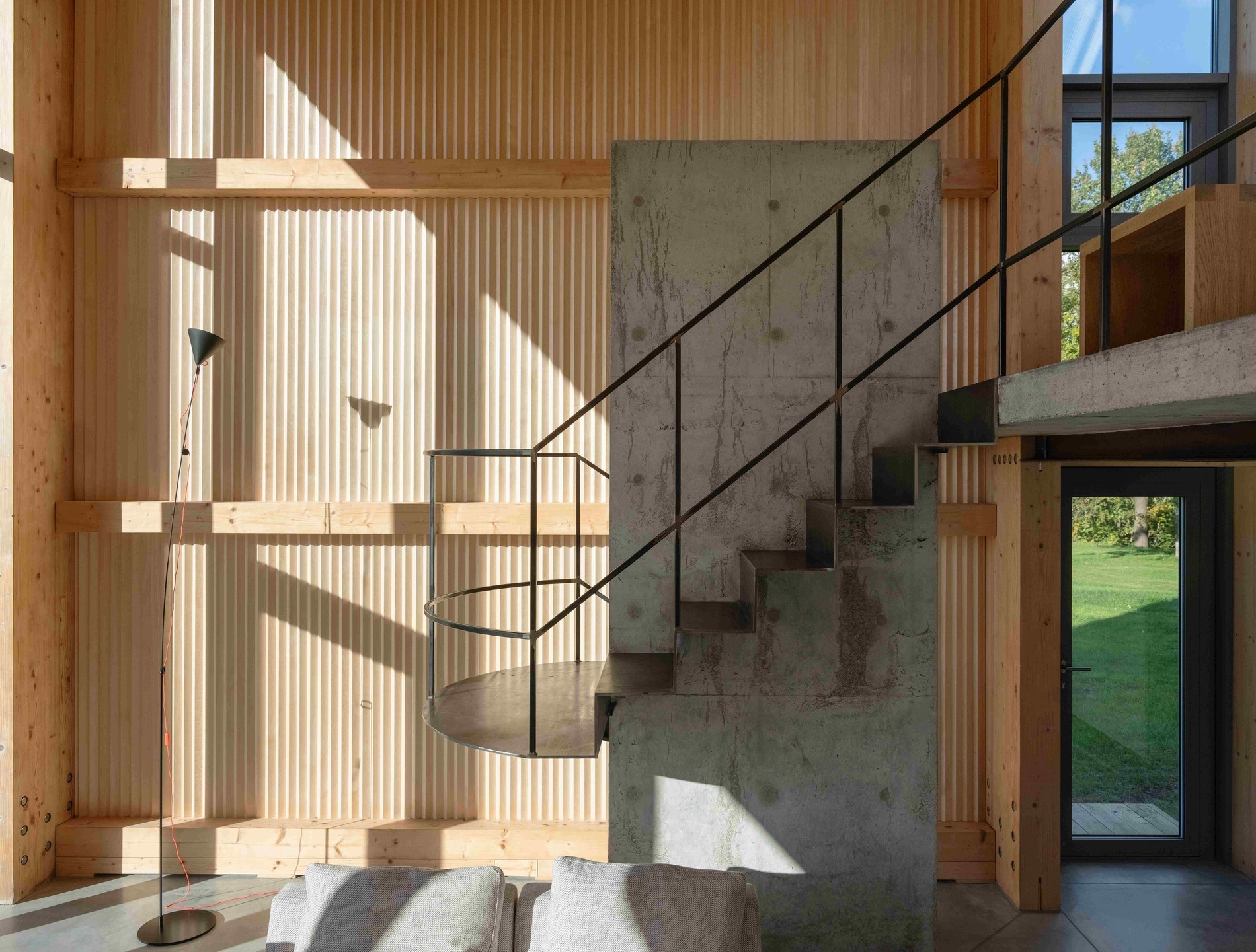 Pevný, odolný, nenáročný na údržbu, chránící její vnitřní, mnohostranný život. Sklon střechy 35 stupňů nejen vytváří dynamickou siluetu, ale je také připraven na energetickou nezávislost, skrze solární energie. Foto: Lukas Mykolaitis