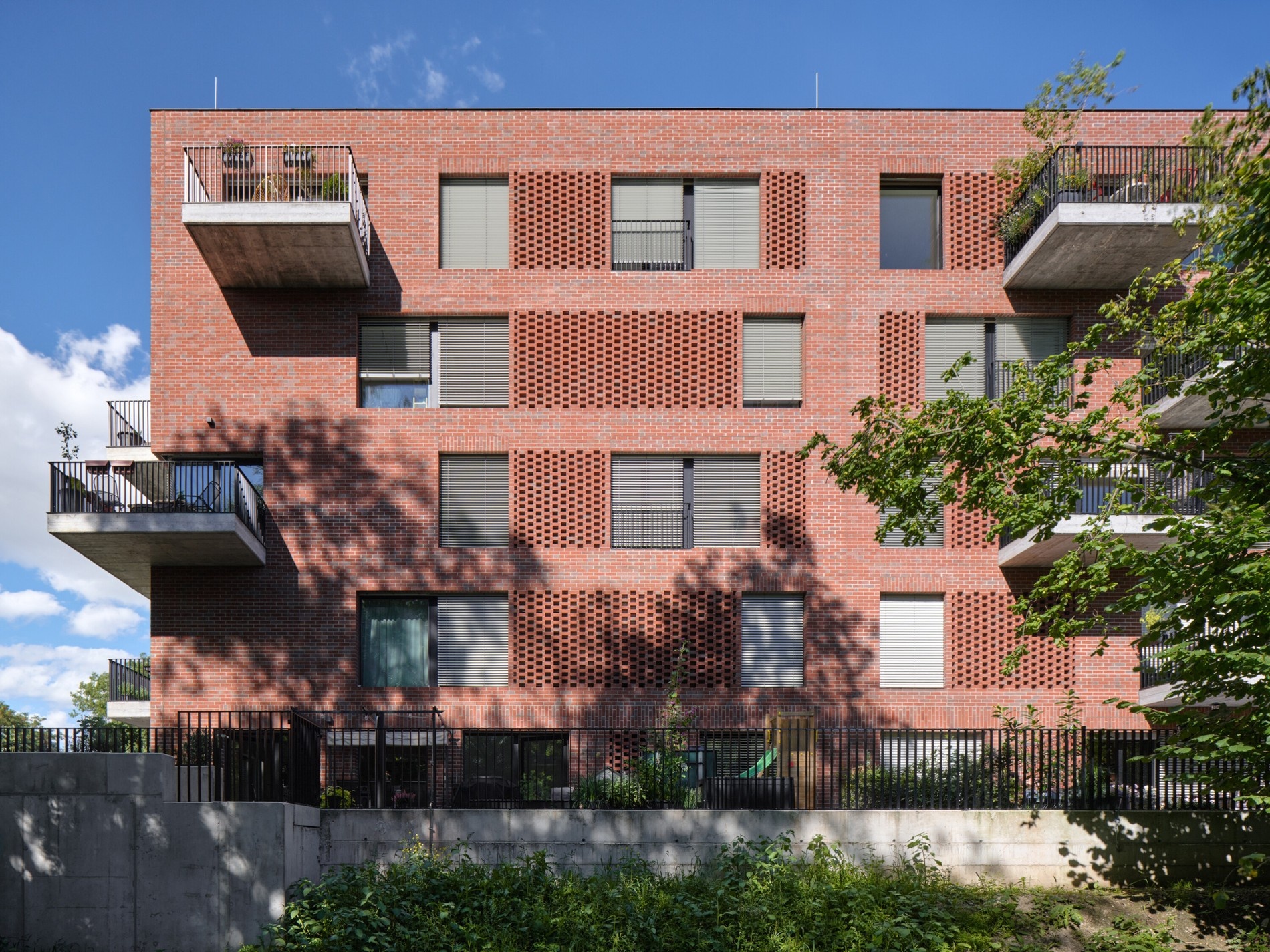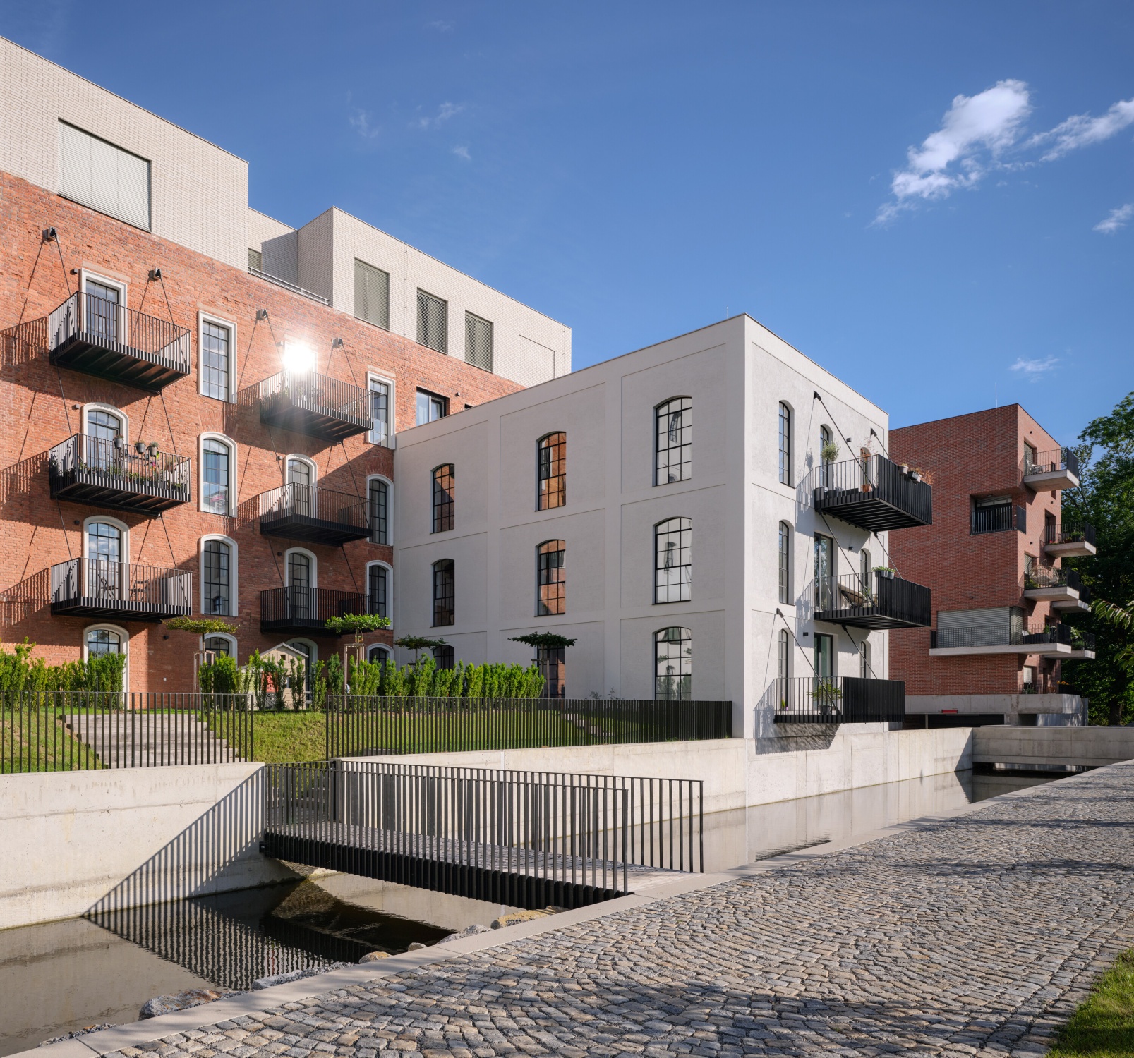 Druhá novostavba stojí u náhonu a řeky. Je to jednoduchý pětipodlažní kvádr s fasádou z červené režné cihly, velkými francouzskými okny a kombinací lodžií a balkonů. Vztahuje se k řece svou pravidelností a otevřeností.
