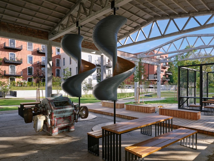 Konverze areálu je založena na principu reuse – maximální využití původních staveb, který považujeme za nejvíce ekologický způsob nakládání se stavebními zdroji. Projekt doplňují zelené střechy a hospodaření s dešťovou vodou, která napájí obnovený kanál.