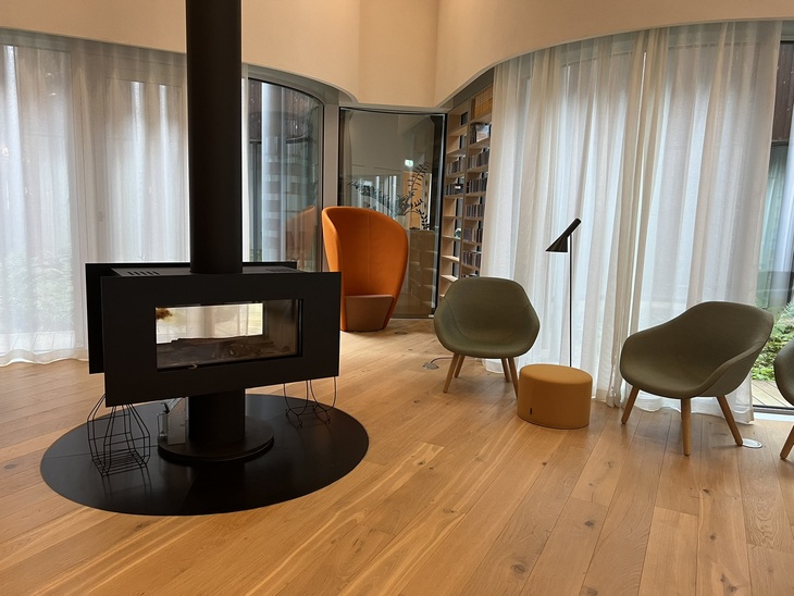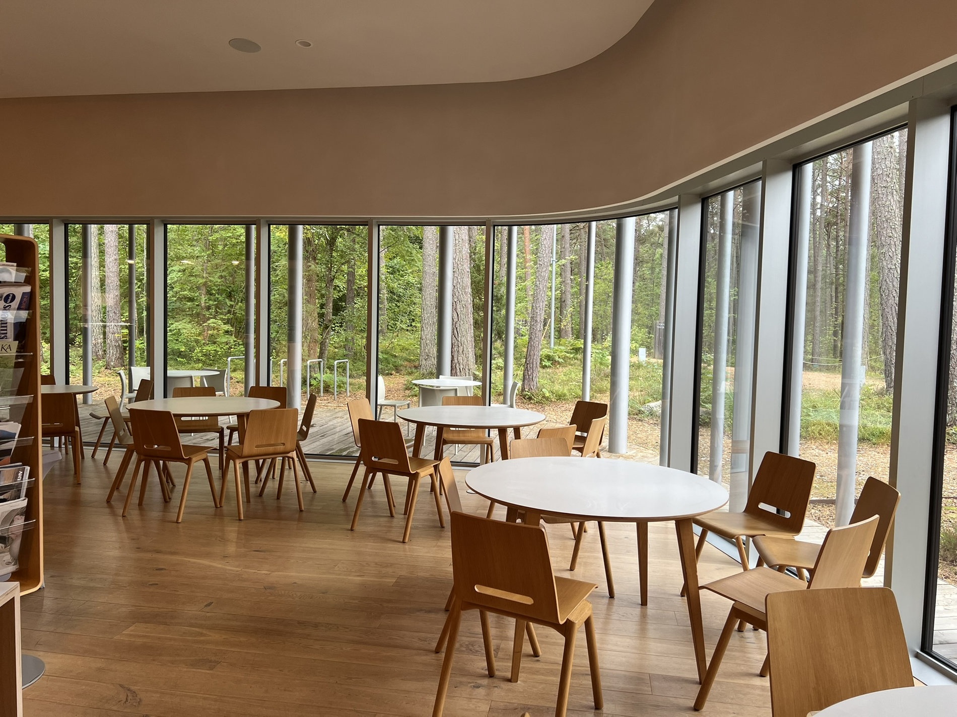 Prostor je nehierarchický – návštěvník se může volně pohybovat bez předem dané hlavní trasy. Světlo proniká skrze atria a velké prosklené plochy, které vizuálně propojují interiér s okolním lesem. Celek působí klidně, je prosvětlený, otevřený okolní krajině a smazává hranici mezi interiérem a exteriérem.