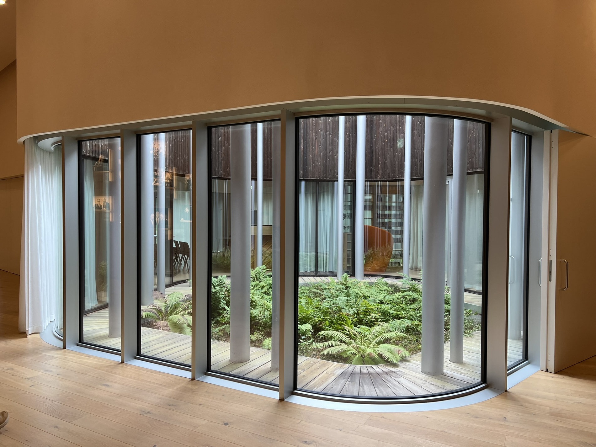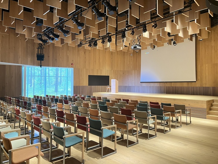 Materiály – dubové dřevo, sklo a beton – jsou použity střídmě a bez okázalosti. Velká okna vpouštějí měkké, rozptýlené světlo a zachovávají kontakt s borovicemi. Hmotu budovy sjednocuje výrazná pozinkovaná plechová střecha. Návštěvník tak prochází jednotlivými navzájem se prolínajícími částmi. Nejprve ho uvede vstupní prostor s recepcí a kavárnou, ty postupně přechází v knihovnu a malý koncertní sál, následně jednotlivé studovny a výstavní prostory. Uvnitř jednoho z atrií se nachází malá ale odhodlaně vyhlížející kaple z betonu. Srdcem objektu je koncertní sál obložený do dubového dřeva s velkým oknem otevřeným do lesa. Výsledný dojem uvnitř domu je tak spíše kontemplativní než monumentální.