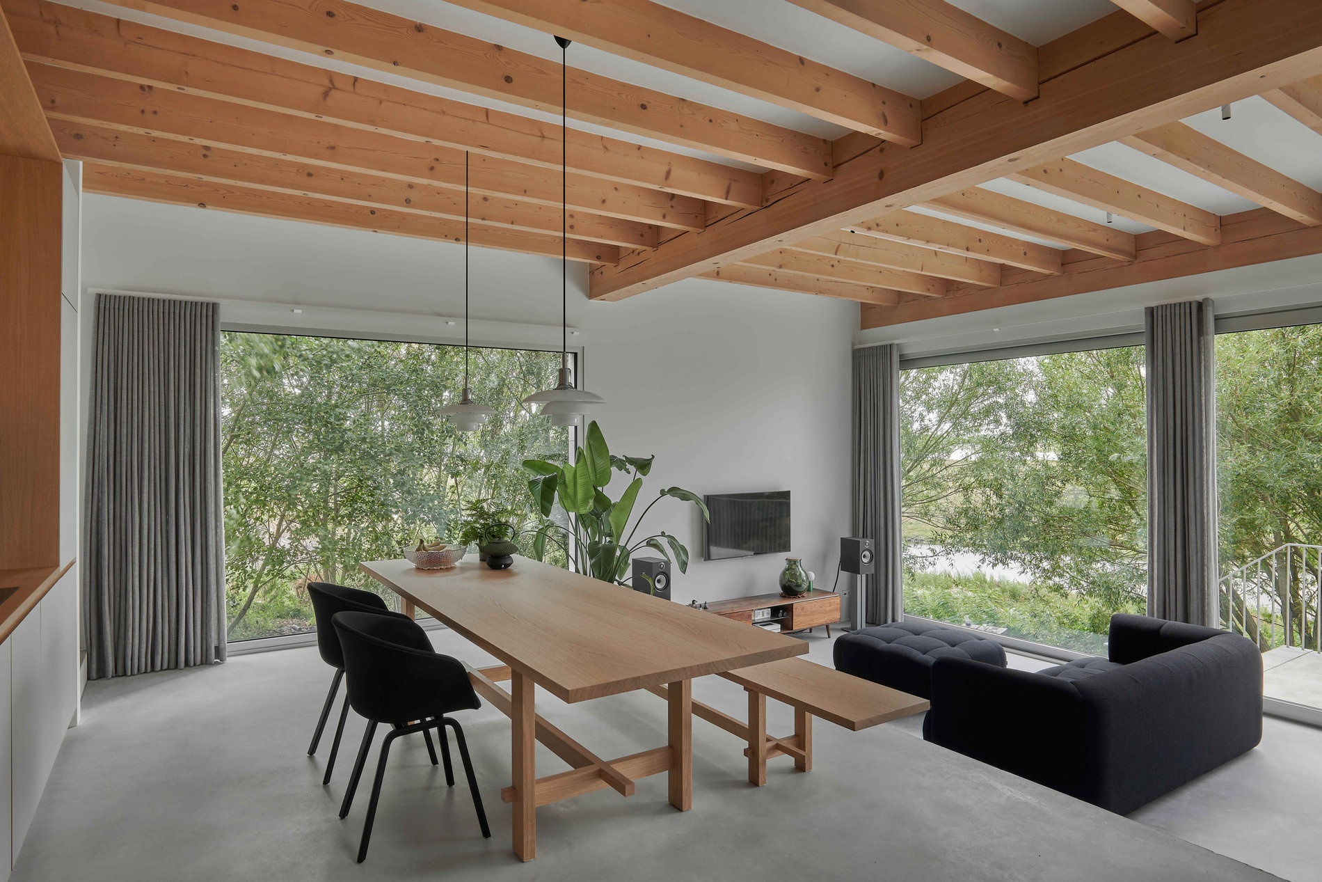 Zapuštěný obývací pokoj vytváří příjemné místo pro vnímání okolní krajiny, s okny od podlahy ke stropu orientovanými do přírody. Koupelny jsou obloženy odolnou a nenápadně elegantní šedou teracovou dlažbou a nabízejí otevřené výhledy do okolí.