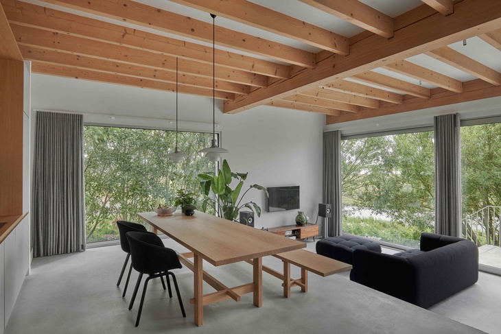 To chrání dům před záplavami a zároveň umožňuje maximální vychutnání výhledů na řeku, přičemž citlivě navazuje na okolní přírodní prostředí. Díky velkorysým okenním otvorům nabízí široký výhled, zejména směrem k mostu v Zaltbommel nad řekou Waal.