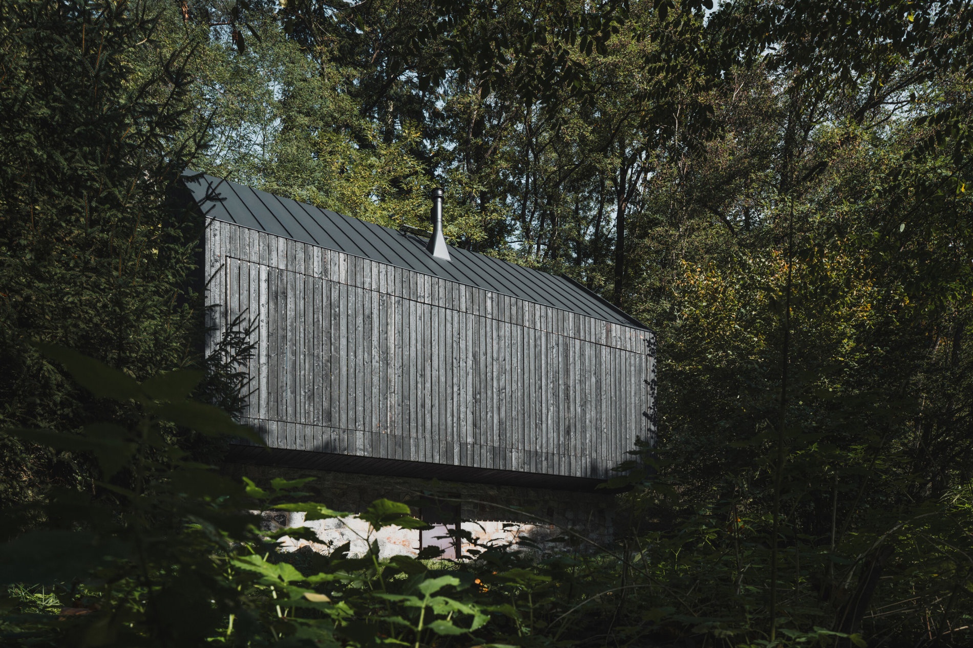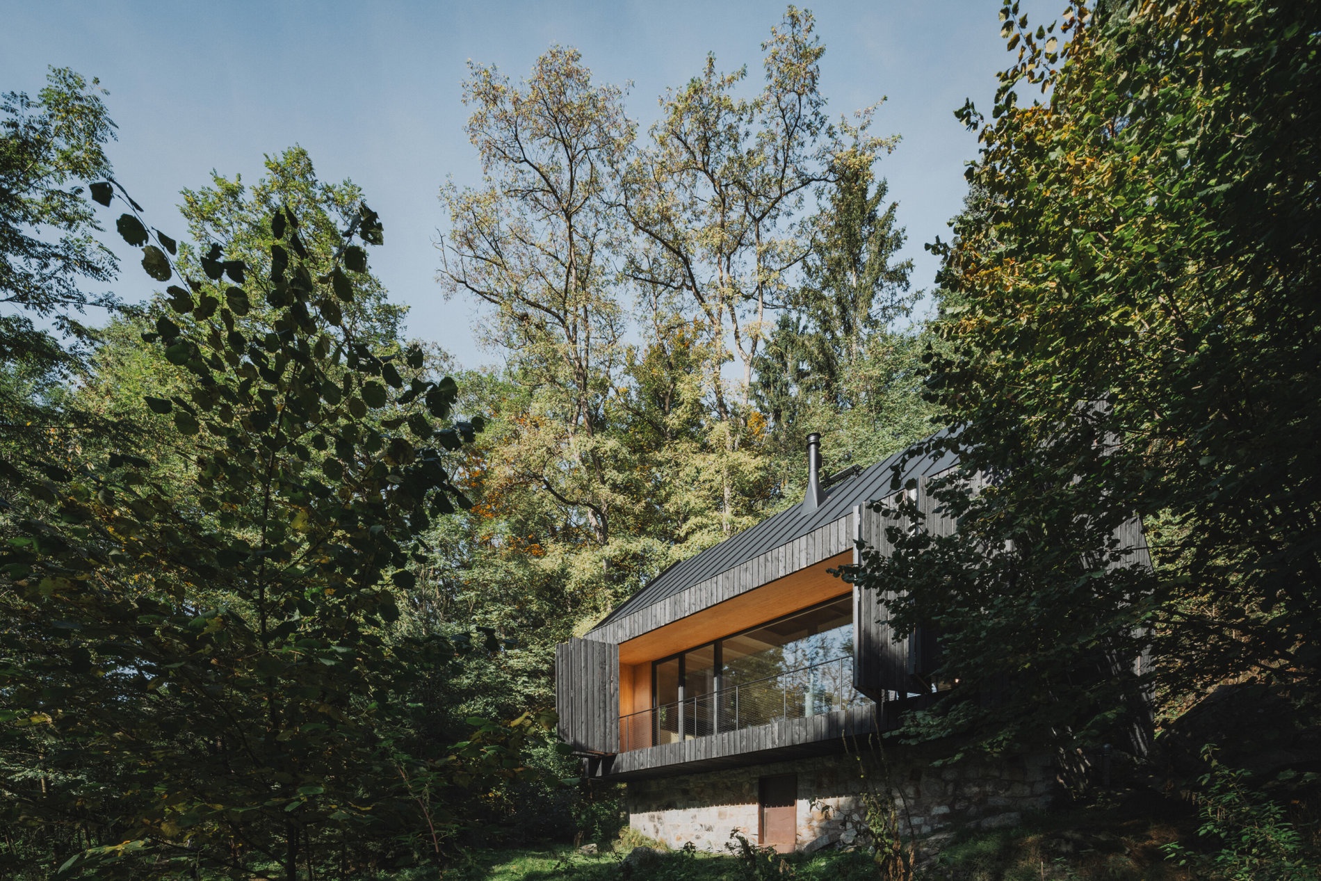 Takže je zde ona vysněná chata, chatka, chatička, rybářská chata, lovecká chata, prostě objekt určený k rekreaci, odpočinku a volnočasovým aktivitám. Jestli ji nazvete rekreační chata, zahradní chata, víkendová chata, je ryze na vašem zvážení. Nostalgie, krásná vzpomínka, ale taky překotné přesuny národa, lidská nevraživost, malost, podrážděnost a závist rozhodně k očistě těla ani duše moc neposloužily. S ohledem na vzpomínky, které vždy nebyly jen radostné, jsem s trochou despektu otevřel projekt zvaný „Mezi skálou a řekou“, alias chata na břehu Sázavy. Ty myšlenky evokoval hlavně dříve zprofanovaný výraz chata. Nicméně zde naleznete, naštěstí, vše to, co většinově zmíněné „chaty“ postrádaly. Je to vytržení ze zaběhaného stereotypu filozofie chatových kolonií, skupinek, které často přinášejí místo radosti a odpočinku konfrontaci a střet lidských naturelů, kdy každý nazíral na ten svůj oddych po svém. A to včetně pošetilých vynálezů, nevkusu, kýčovitosti. V lepším případě laická neestetičnost a nevhodnost materiálů a řešení. Nebojte se, dnes se umělecká lidová tvorba z toho, co se kde našlo a přivlastnilo, nekoná. Toto řešení je totiž odvozeno spíše od severských předobrazů. Je jasné, že nemůžeme všichni zaplnit svými solitéry lesy, hory, jezera, řeky, prostě volnou přírodní krajinu a hrát si na zálesáka uprchlého před civilizací v jedné z nejlidnatějších zemí Evropy. V tomto případě se však zadařilo. Ocitli jsme se ukrytí v koutě lesa, takřka neviditelní, spojení s přírodním prostředím v blízkosti řeky. Přiznám se, že bych za sebe viděl trochu více světla, slunce a volného místa okolo chaty. Možná tak působí fotografie za deště, kdy počasí limitovalo některé pohledy.