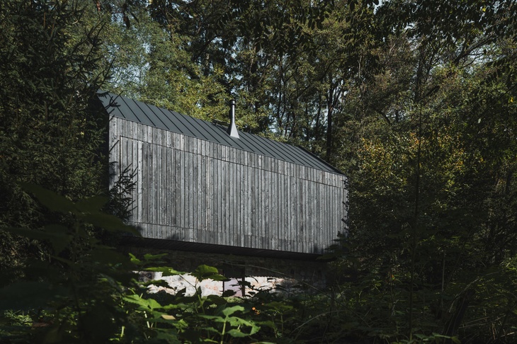 Chata na břehu Sázavy nahrazuje svou předchůdkyni na stejném místě. Z původní chaty zbyla po požáru jen kamenná podezdívka, kterou nová stavba přirozeným způsobem využívá. Poskytuje jí ochranu před povodní a nadhled – nad řekou a možná i nad každodenním shonem. Stačí shrnout okenici otevírající chatu k řece a pak už jen poslouchat šplouchání řeky a šumění borovic, pozorovat ledňáčky nad hladinou a peřejky za balvany. Opéct si buřty na ohni, zatopit v kamnech, povídat si s kamarády. Večer pak cestou do pokojíku pod střechou, velkého tak akorát k přespání, mizí horizont řeky a otevírá se pohled do skal za zády chaty – to, aby nikdo nezapomněl, jak je jimi tady Sázava tísněna.