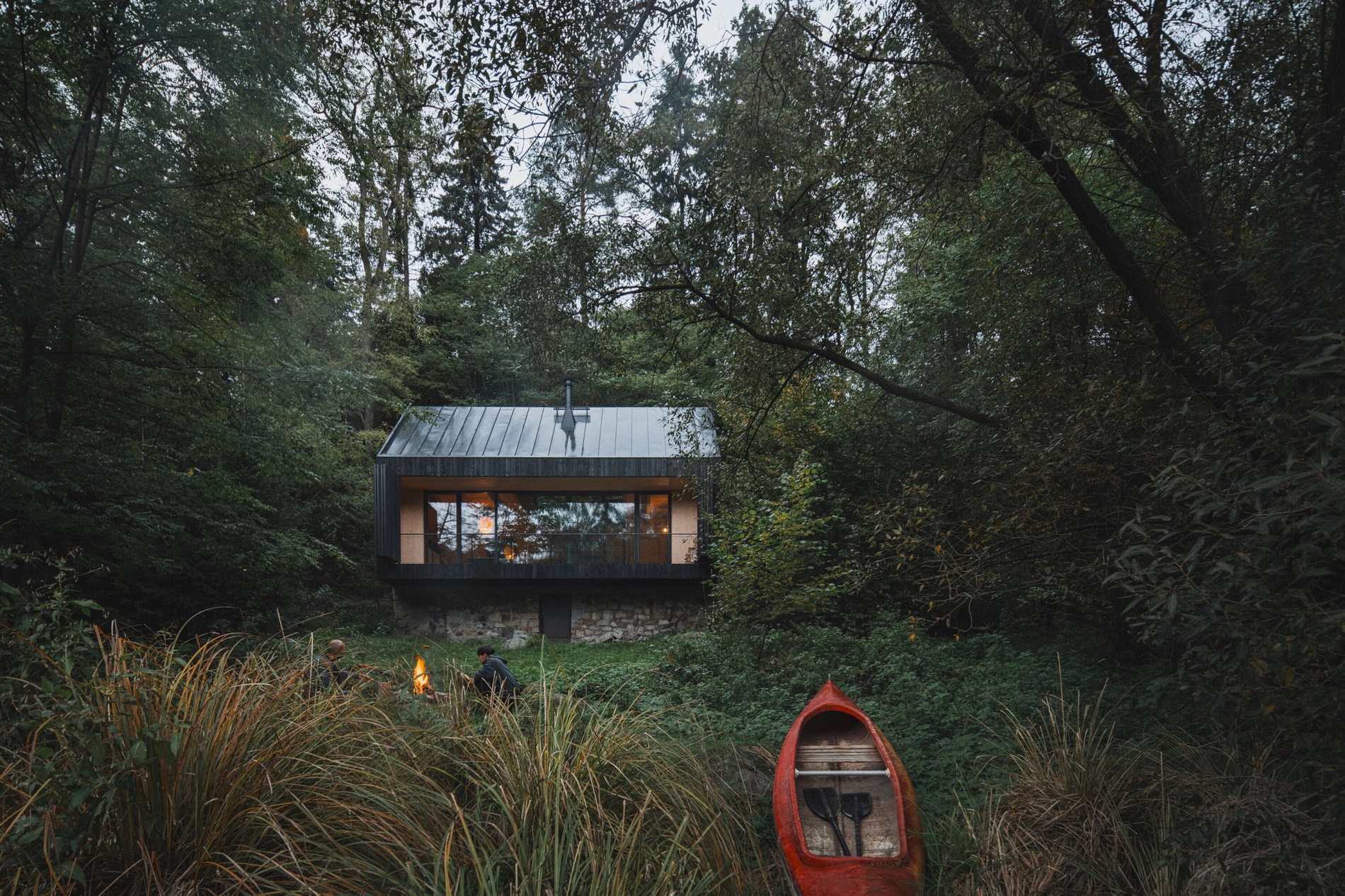 Dřevěná chata mezi skálou a řekou
